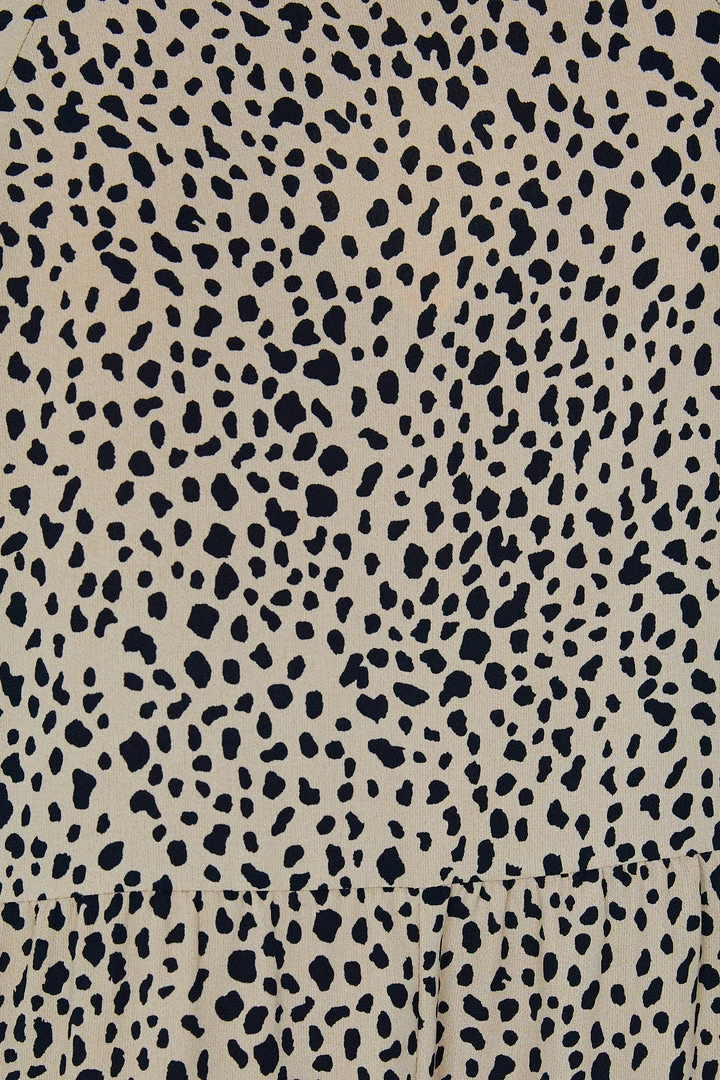 - Key Features: Mini length. Long sleeves. Cinched at the cuffs. V neckline. Fabric waist tie. Tierred skirt. Relaxed fit. Maternity friendly.
