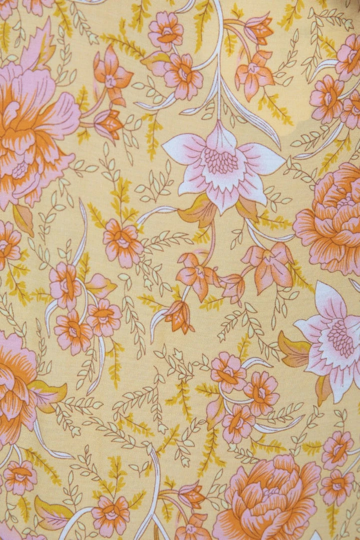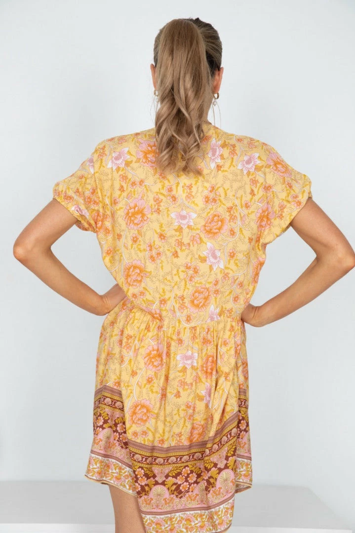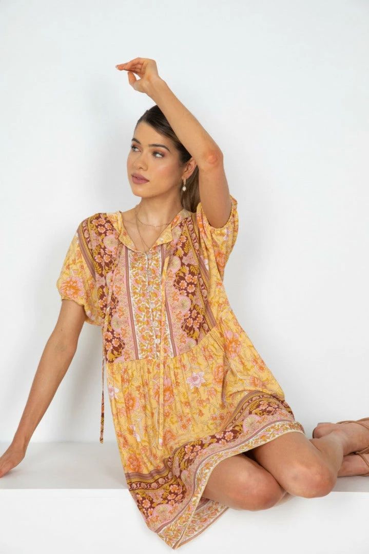 Our Seara Dress comes in a stunning yellow base multi prints. This relaxed mini features a round neckline with tie detailing, with cinched sleeves. This gorgeous piece will add a lovely pop of color to your summer wardrobe!