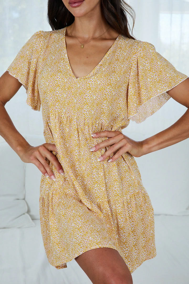 Our Sparks Dress comes in a yellow print. This dress features a v neckline, butterfly sleeves, and a flowy skirt. This piece is made from a lightweight material, which promotes the breathability of the garment while providing a smooth feel.