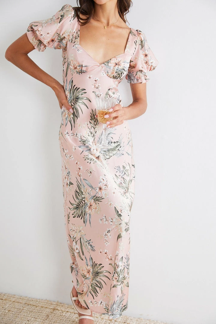 - Key Features: Puffed sleeves. Sweetheart neckline. Floral Print. Maxi Length. Invisible side zipper.