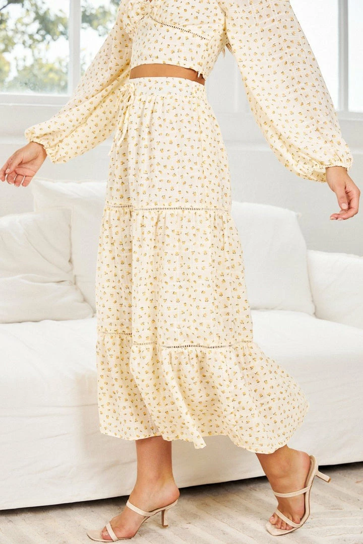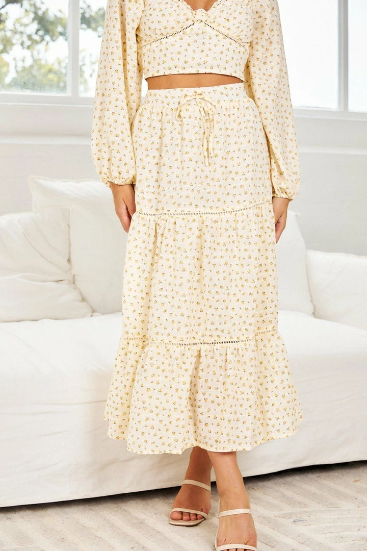 Our Gleci Skirt comes in a yellow tone with small flower spots all over. It features a maxi length, subtle piping details around the garment, and an elastic waistband. Complete the look with our Gleci Top – Yellow Print.