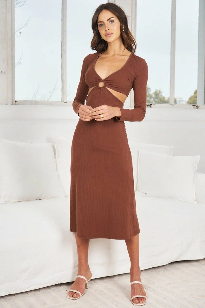 Our Justina Dress comes in a rich chocolate tone. It features a plunging v neckline, long fitted sleeves, a skirt split on the front left side, and a cutout at the midriff. This two-piece still midi pairs beautifully with heels for an effortless transseasonal look!