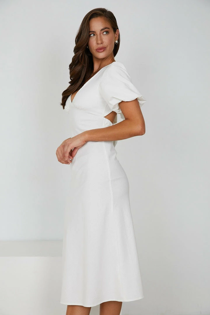 Our Vanna Dress comes in stunning white color. This midi features a low v neckline with short puff sleeves and a flowy skirt. This wardrobe staple is perfect for an effortless and comfortable fab look.
