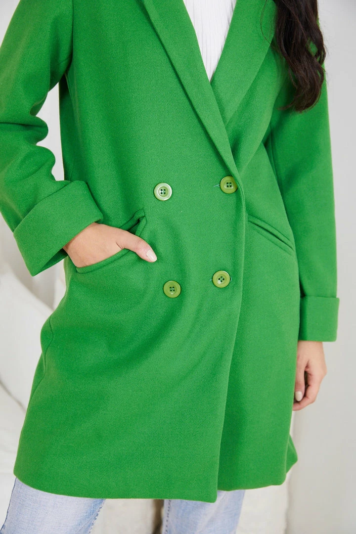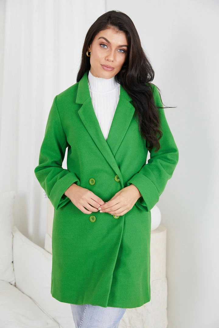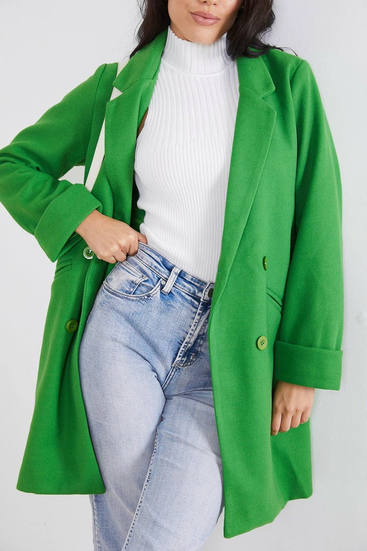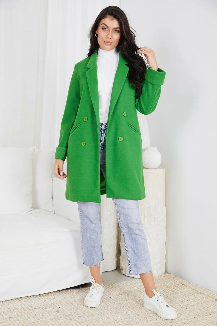 Our Jasperine Coat comes in a vivid green colour. Smart dressing with flavors of casual and play, this outerwear is designed with a notched collar, long sleeves with folded cuffs, button closure, side jetted pockets and thigh length hem. Dress up by pairing this with a thigh high leather boots and stud earrings!