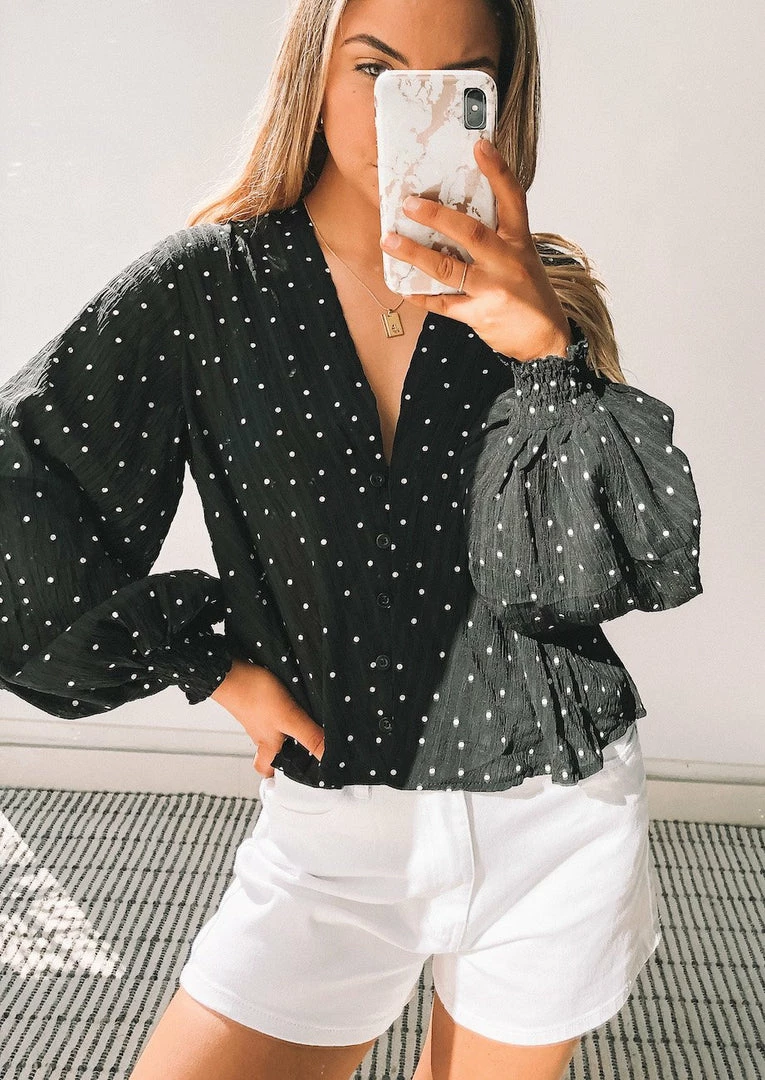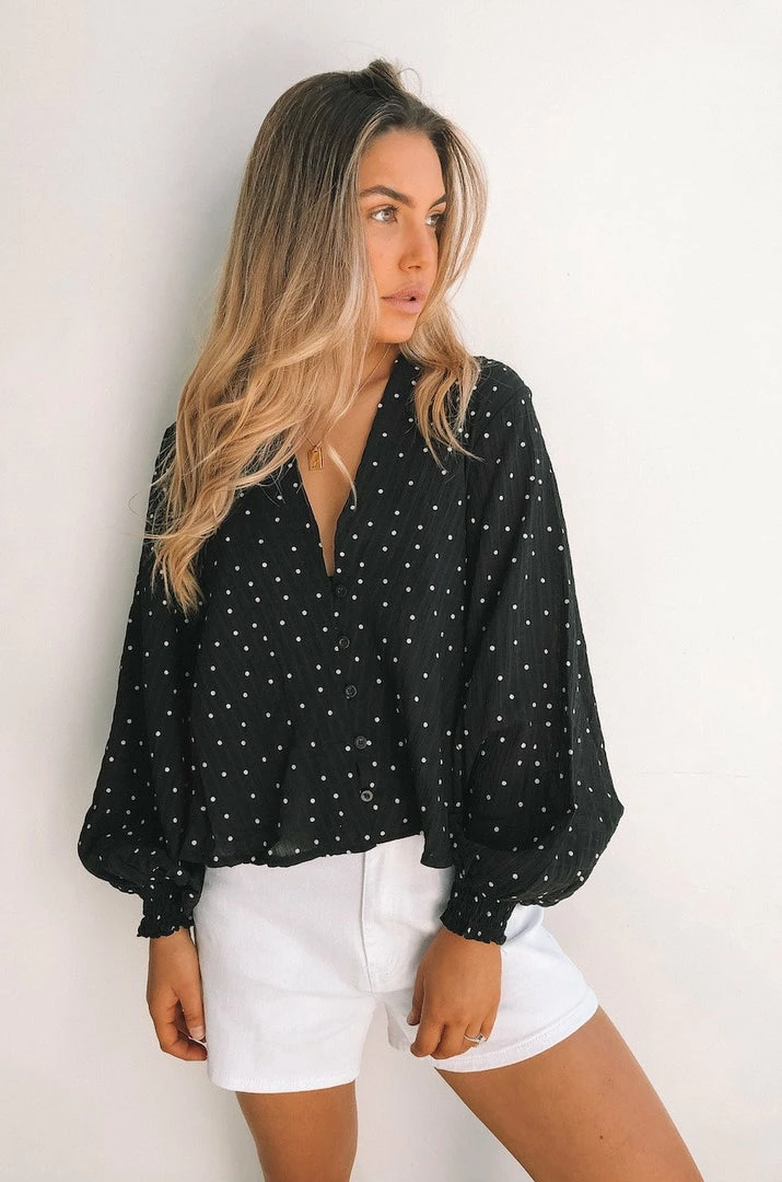 Our Sakura Blouse is a black base with white spot print. It’s a gorgeous lightweight material with a sheen feature. The v neckline is met with buttons making this ideal for breast feeding. The balloon sleeves are cinched at the cuff with shirred detailing.