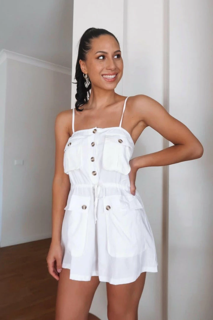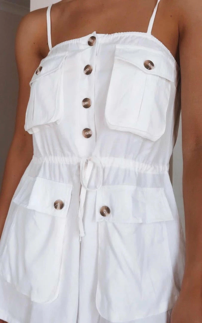 Our Zefa Playsuit comes in a fresh white tone. The bust and pockets are decorated with tortoiseshell inspired buttons. The waist features a drawstring for customisability and comfort.