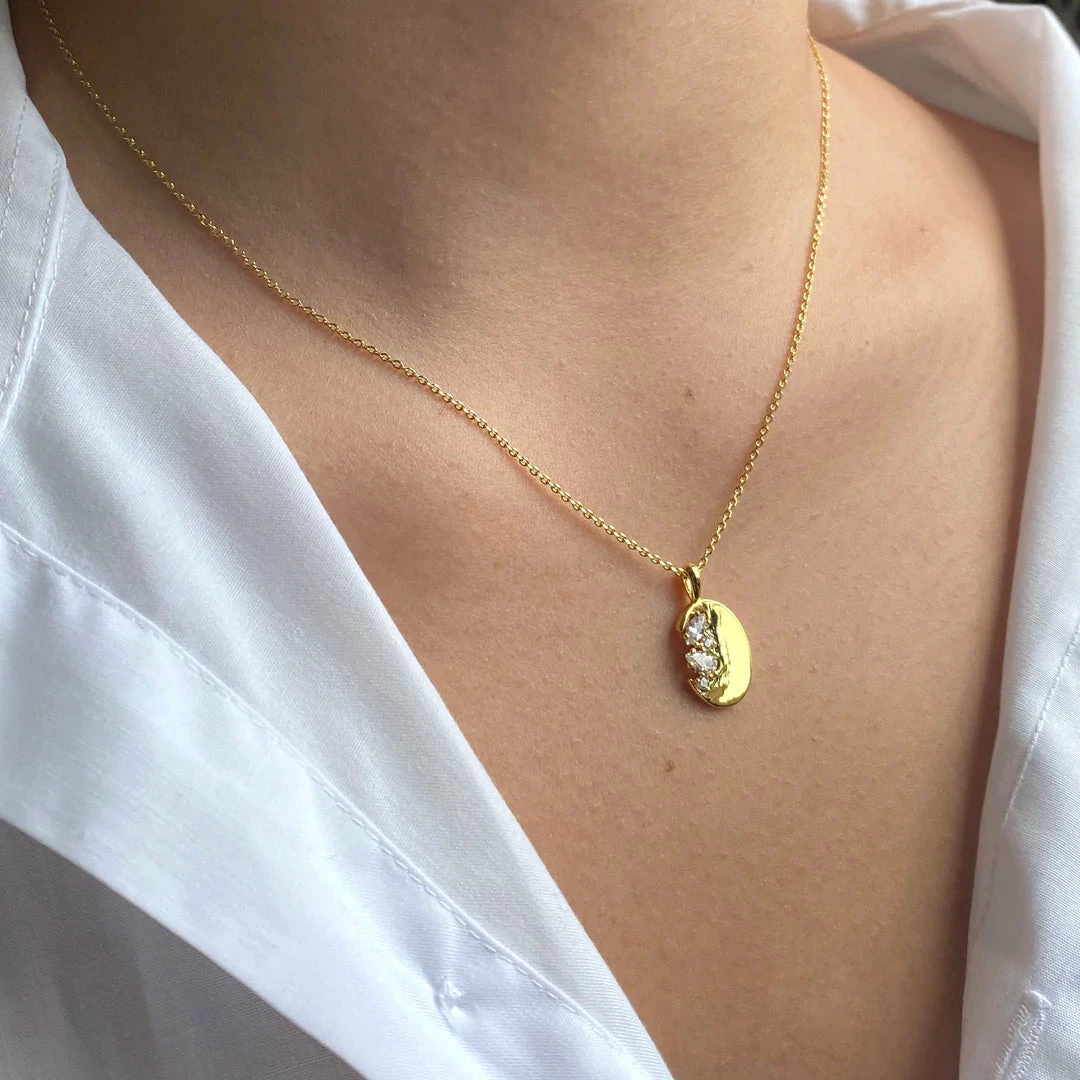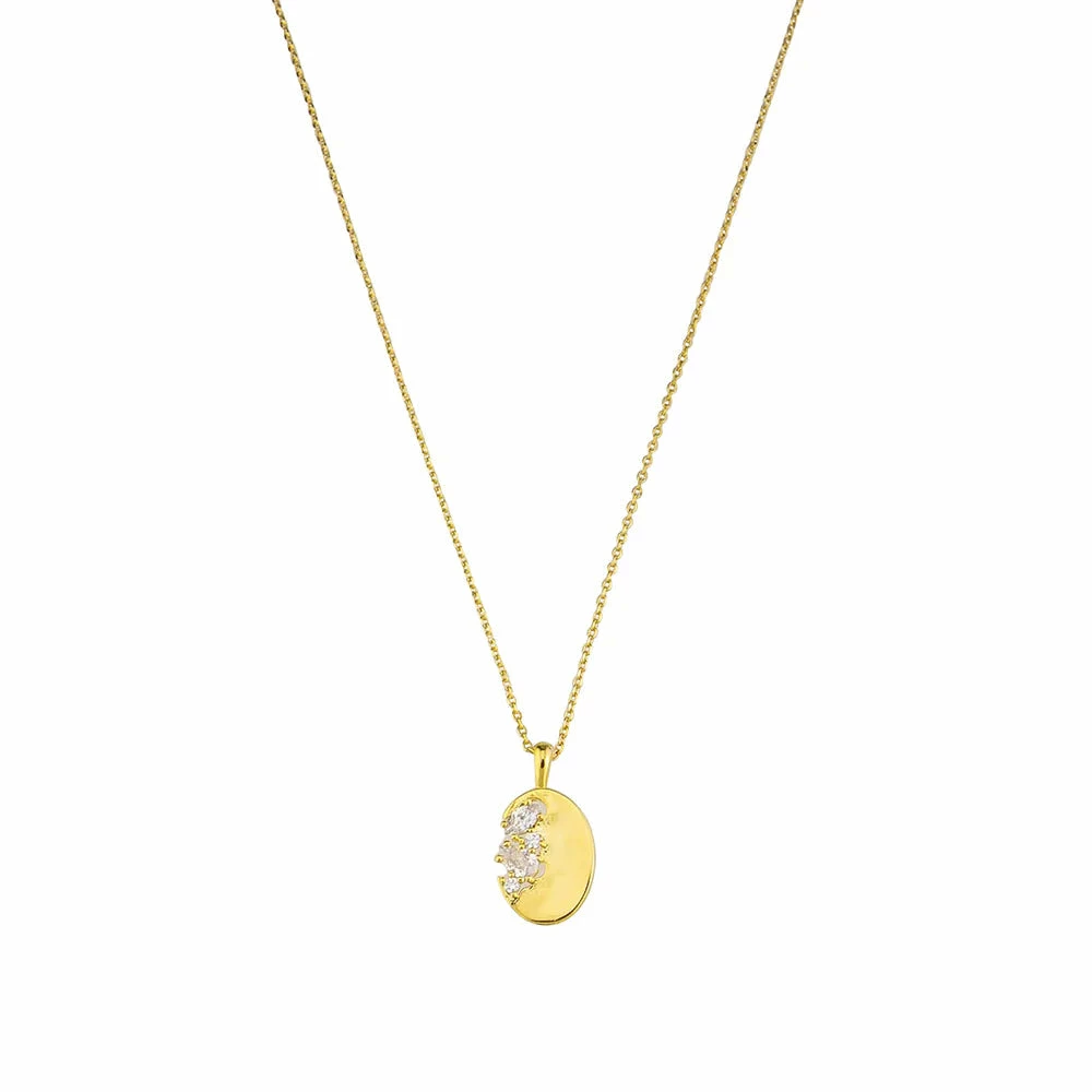 The Davina Necklace has a fine gold chain with oval gold charm incrusted with Swarovski crystals. A pretty style that is perfect to layer.
