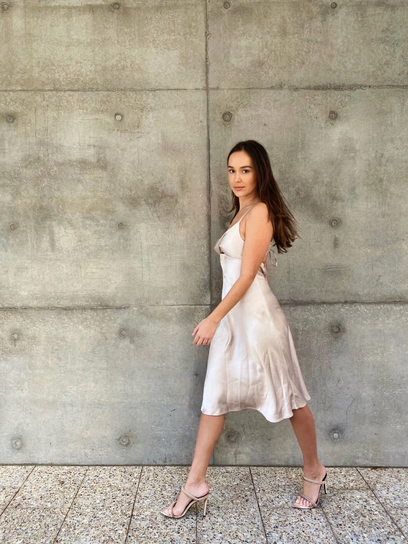 Our Florinda Dress comes in a stunning champagne tone. It features a plunging v neckline, spaghetti straps, cutouts at the sides and back. This stunning midi pairs beautifully with heels for a wonderful look at your next formal event!
