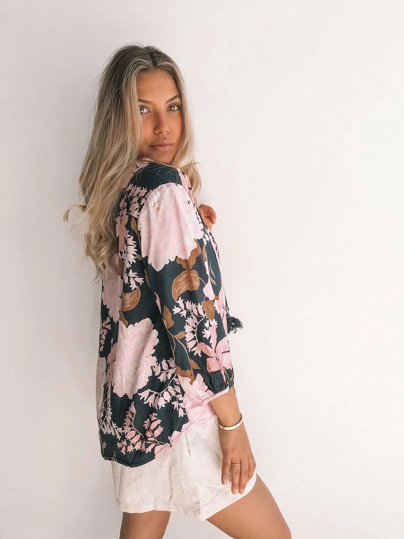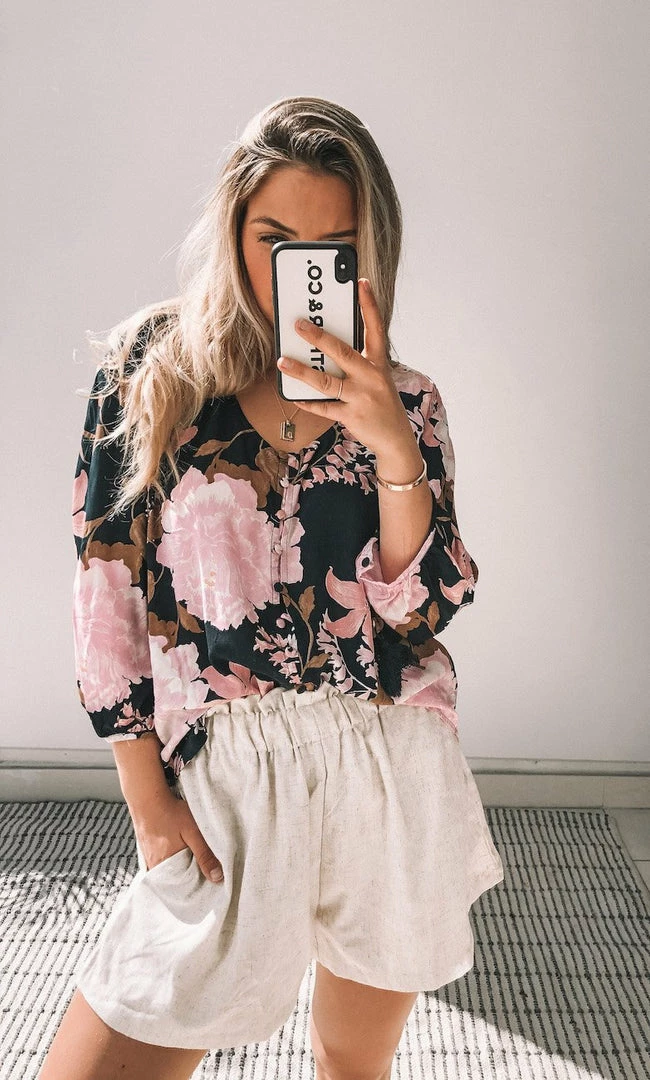 Our Marha Top is a moody navy & pink floral print. This lightweight top is comfortable and casual, best paired with a black skirt, pants or shorts.