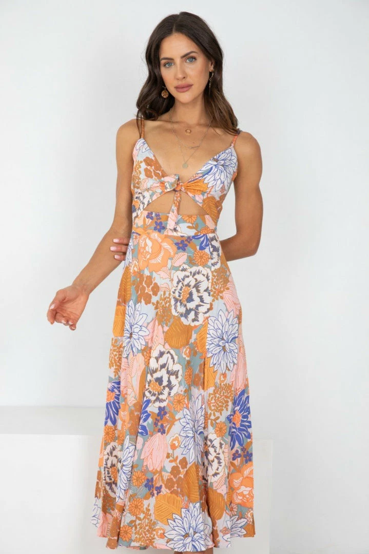 Our Karago Dress is a gorgeous, peach, indigo, mint, off-white, baby pink, beige, tan, dark brown, & orange floral print. This printed midi comes in a lightweight non-stretch fabrication that you’re sure to love during the warmer months. The gorgeous tie-up bust and easily adjustable spaghetti straps are feminine & comfortable additions to this garment. The skirt flows out making this ideal for maternity wear.