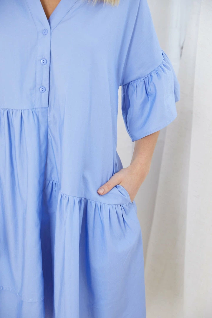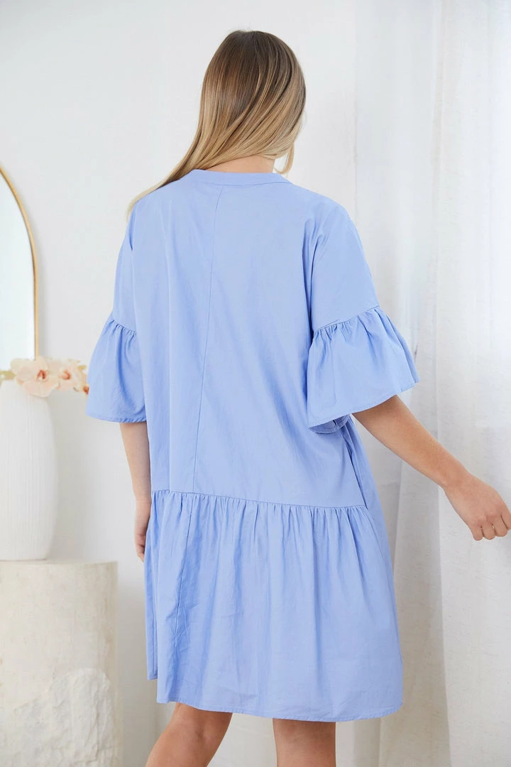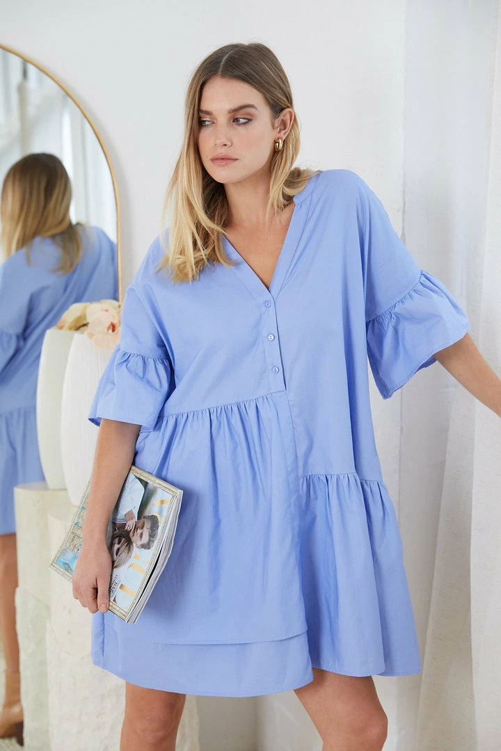 Our Aphra Dress comes in a mellow blue colour. A conversation starter, you’ll be the talk of the town in this mini that features a mandarin collar with v-neckline, centre-front buttons, short circular flounce sleeves and layered tiered skirt. This feminine dress looks beautiful with pastel sandals and a cute square bag!
