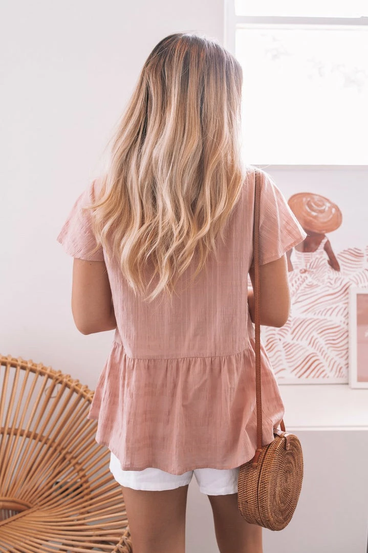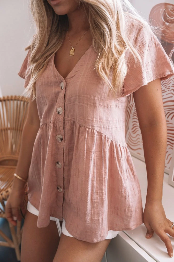 Our Arlo Top comes in a stunning terracotta tone. This relaxed summer staple features a V neckline with buttons down the front, perfect for breastfeeding mums. Pair with white shorts for an effortless summer look.