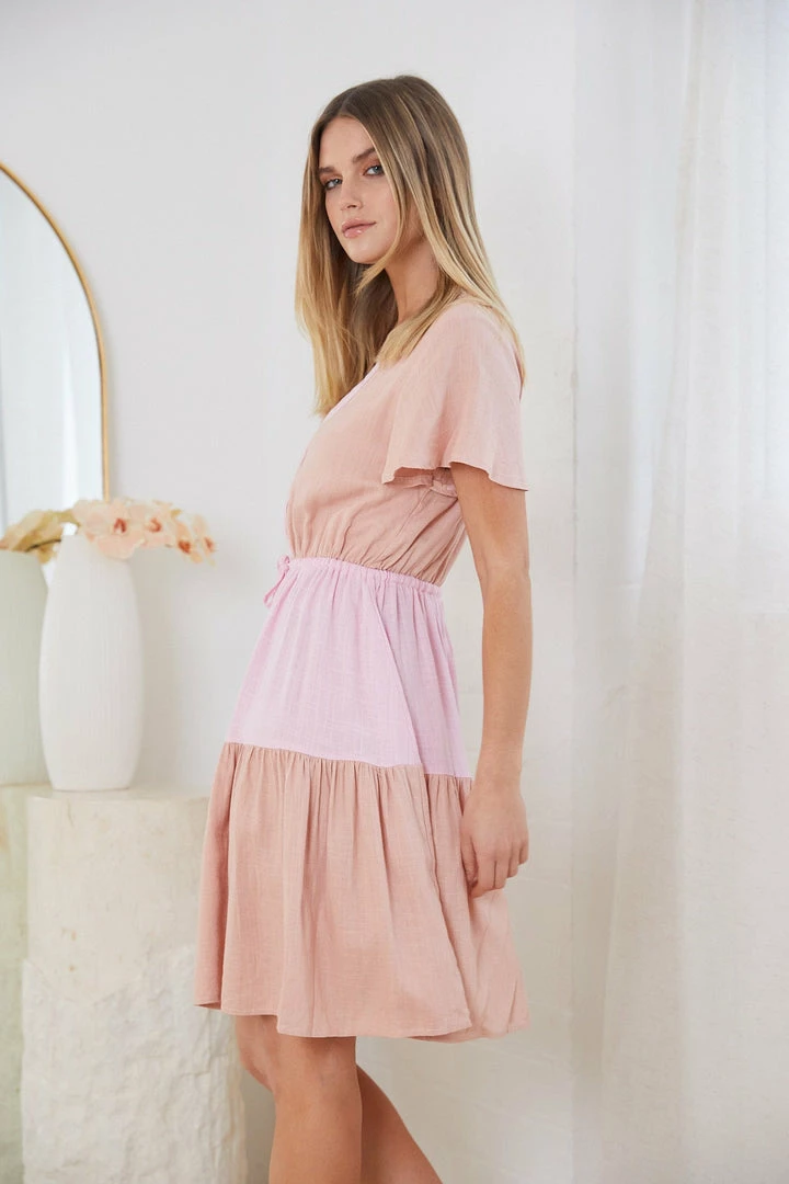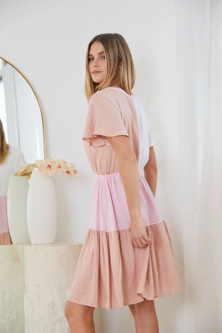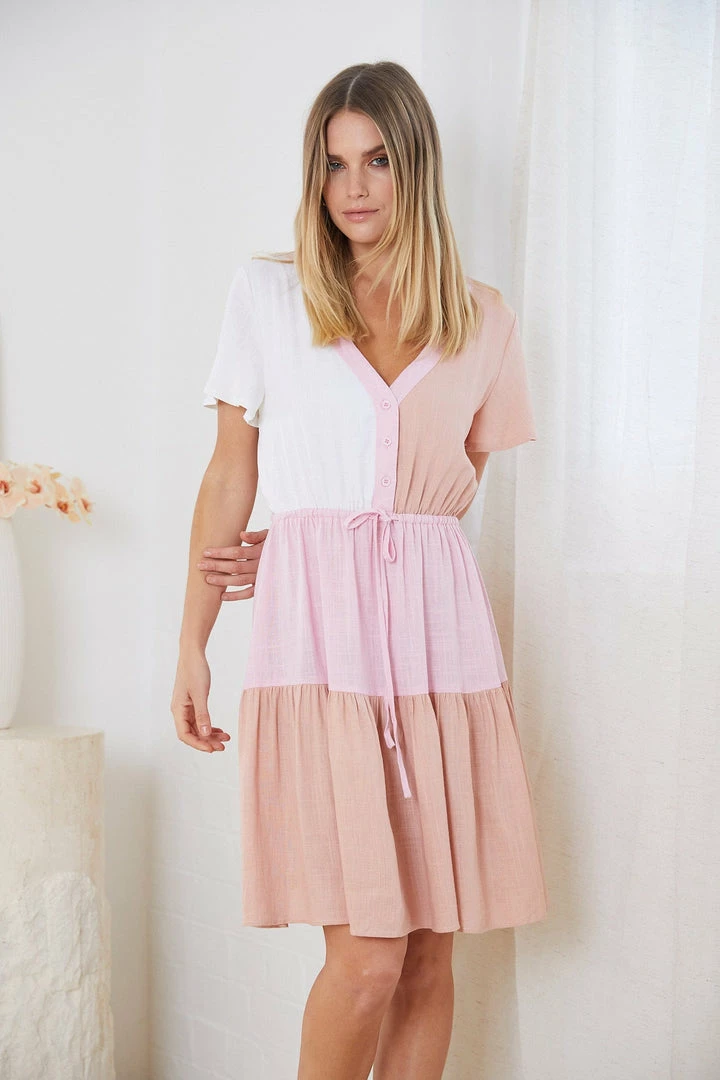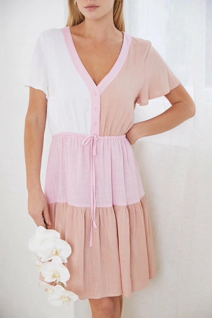 Our Calabrene Dress comes in a captivating shade of white, brown and pink. Enjoy the dynamics of hue in this colour blocking knee length dress that features a soft v-neckline, top-front buttons, short flutter sleeves, gathered waist with string and drop waist skirt. Pair with a knotted strap espadrille platform sandals for a revitalizing weekend scroll with the girls!