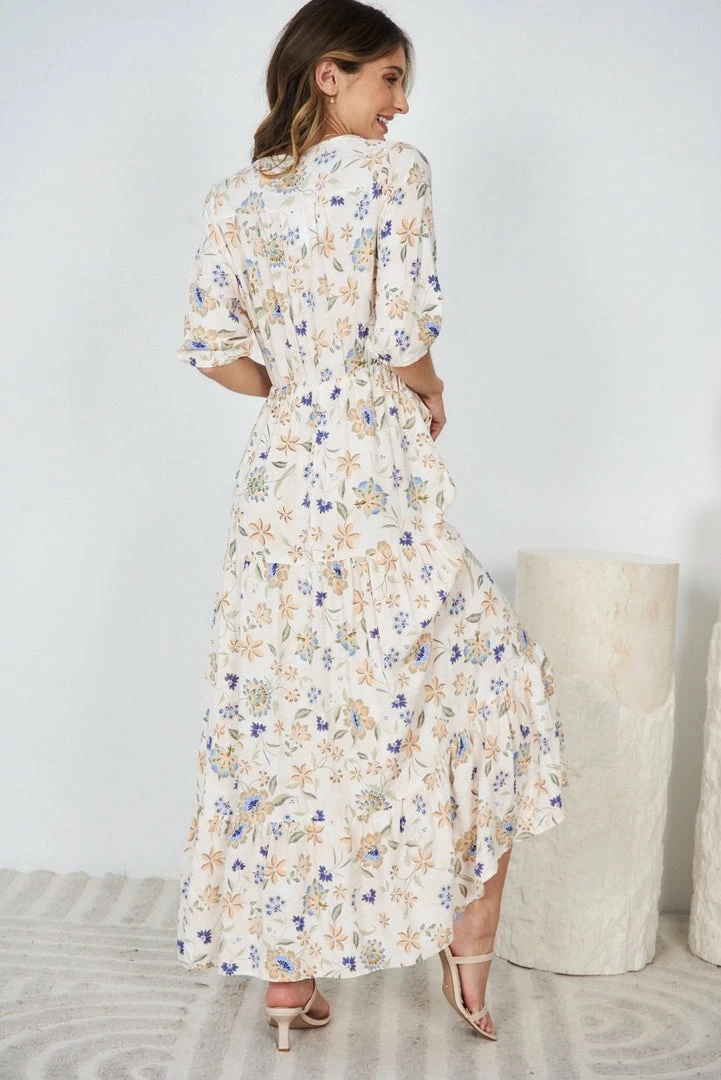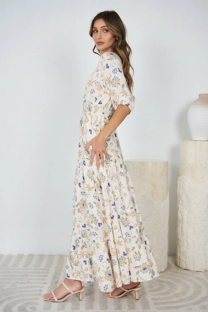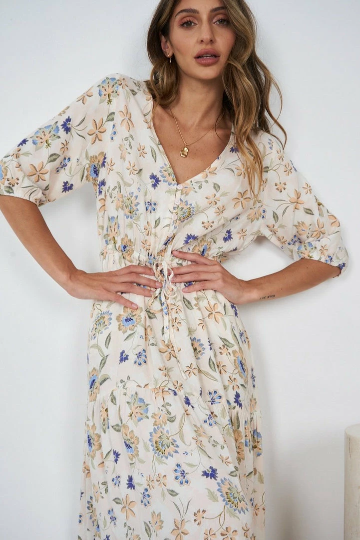 Our Howie Dress comes in a beige base with olive, dark purple & brown-toned floral print. This relaxed fit maxi features a v neckline with buttons on the front, drawstring waist and relaxed, layered skirt making this ideal for maternity wear. She pairs beautifully with a rattan bag and tan accessories.