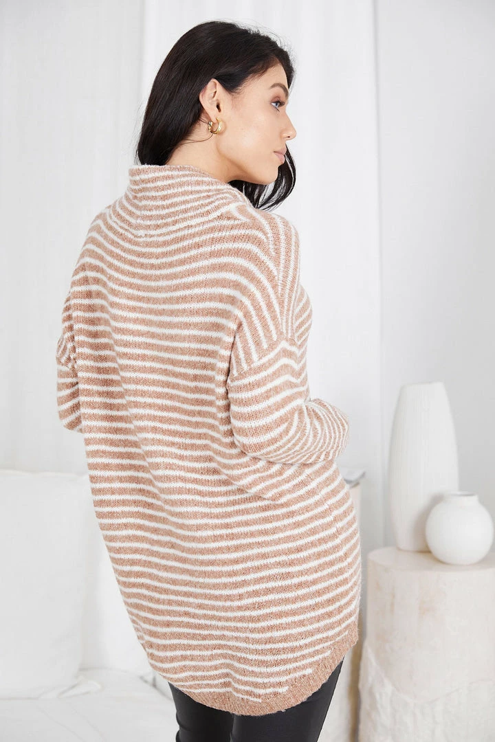 Our Cheska Knit comes in a muddy brown base with white stripe pattern. Always a sweater weather for the go-getter, this jumper is the perfect piece to battle the cold season with its medium weight fabrication, folded standing collar and long drop sleeves. Wear it together with a pair of trendy skinny pants and laced booties!