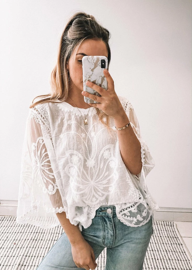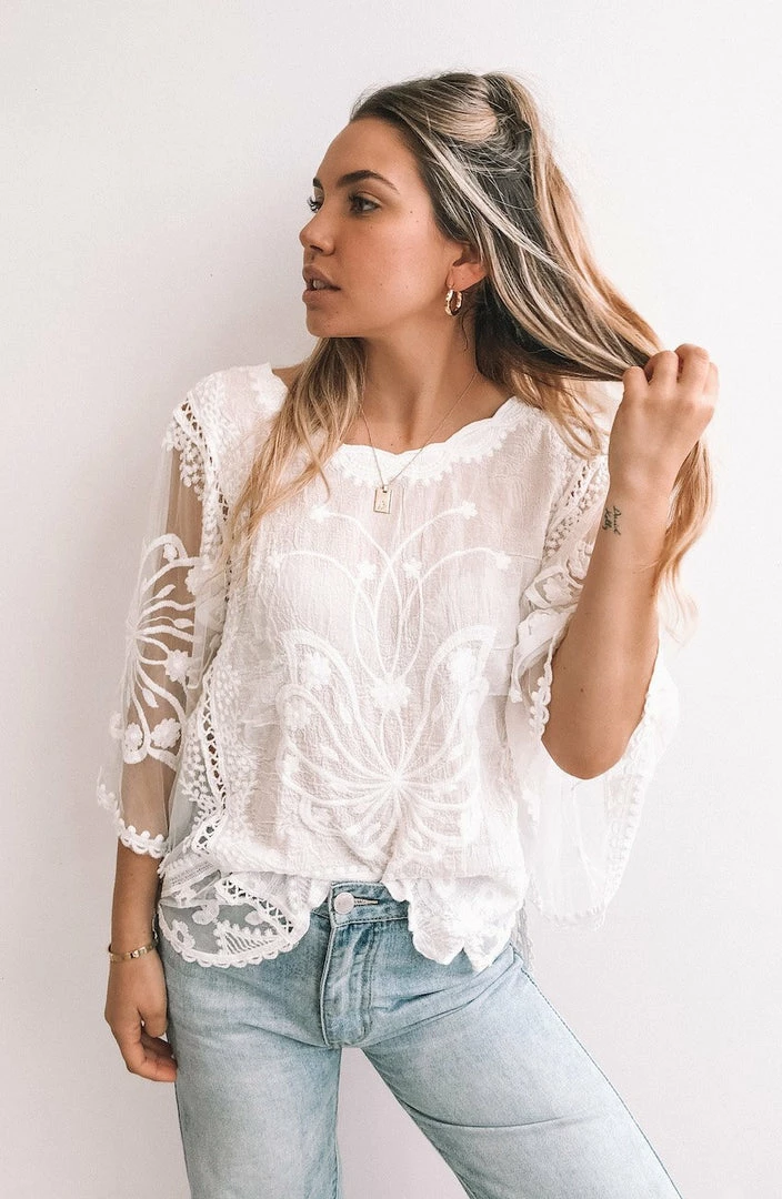Our Gabrielle Top is a white tone. This lightweight sheer top features lace embroidery for a gorgeous bohemian look. The relaxed fit is ideal for the warm weather to come and pairs beautifully with a white or nude lacey bra. This is a one size fits all that fits sizes 6-14 depending on the desired fit.