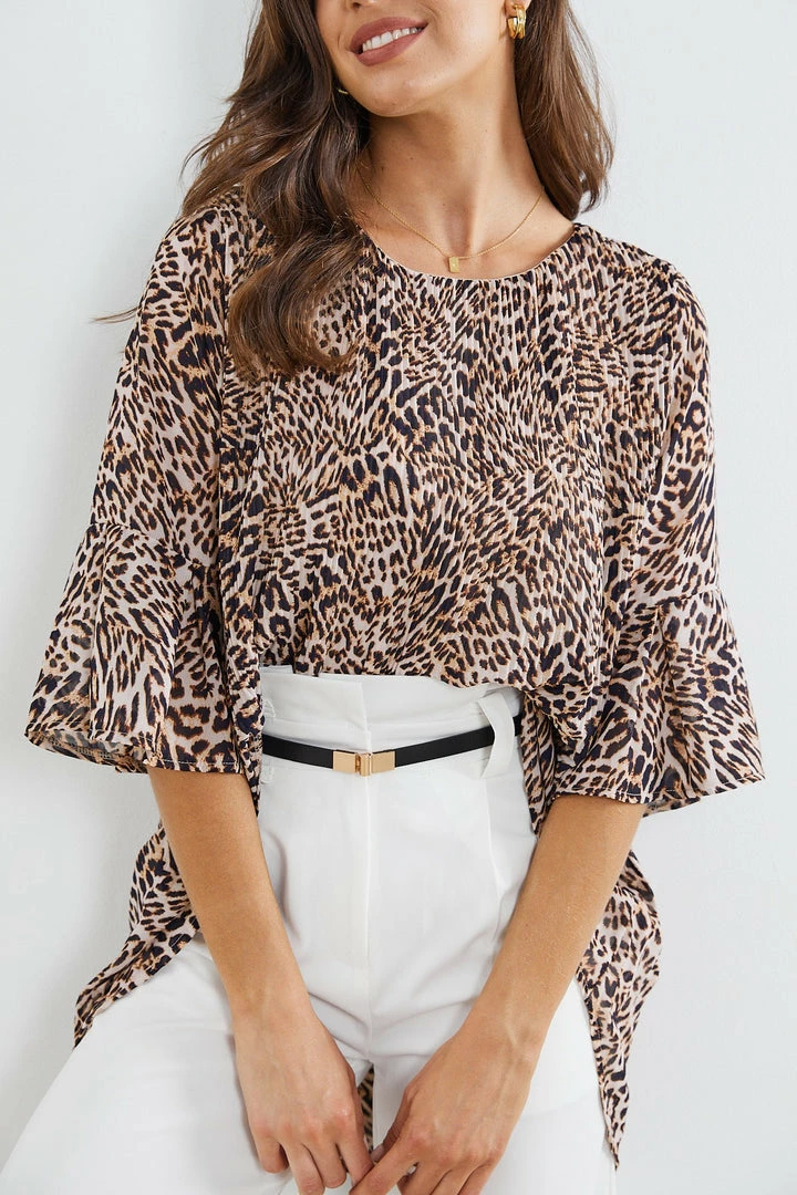 - Key Features: U-neckline. Angel sleeves. Animal print. High-low hem.