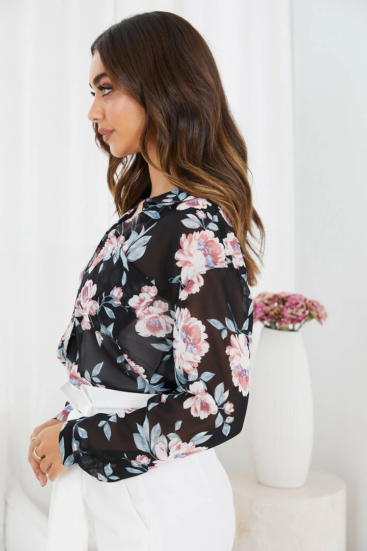 Our Jezzibele Shirt comes in an elegant black base with floral print in hues of green, burgundy and cream. Exuding feminine feels with its print, this long sleeved top features the classic shirt silhouette inserting a touch of corporate flavor. Wear it over a black cami and pair with trousers or a pencil skirt for an effortless refined look.