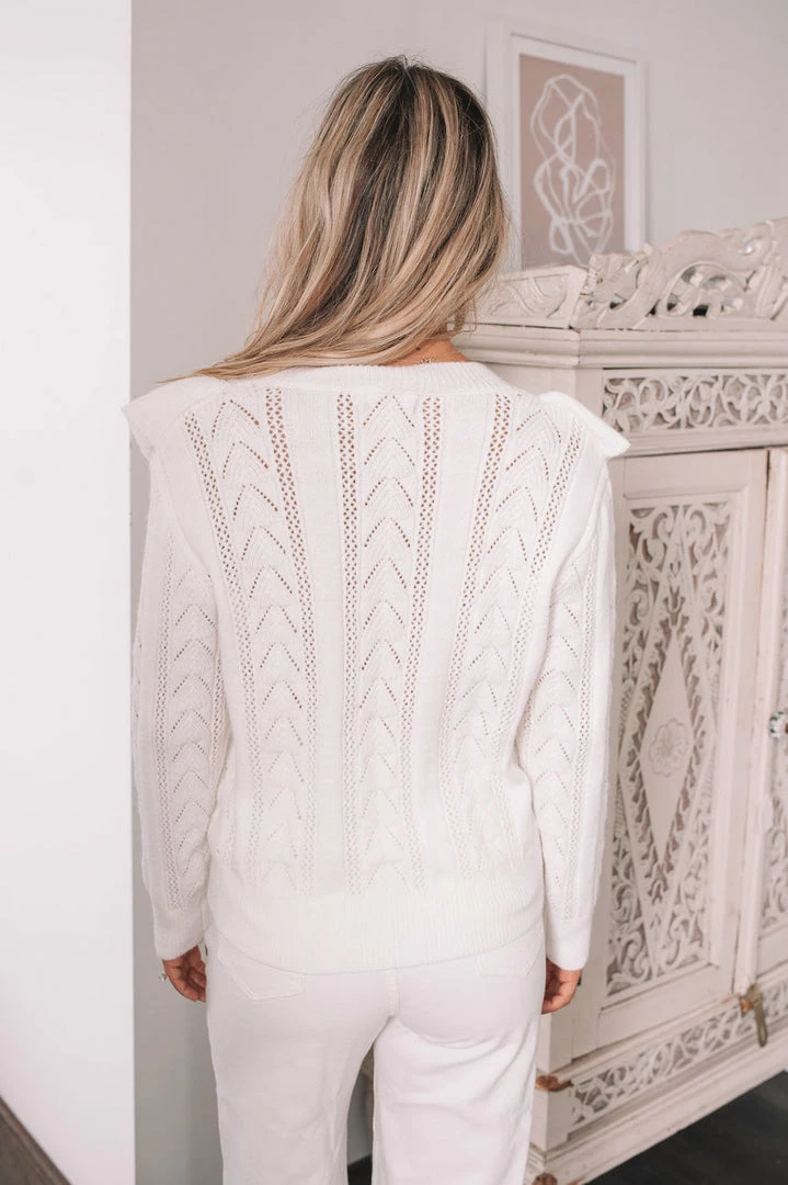 Our Nieva Jumper comes in a frosty white tone. This cozy knit features a V neckline, ruffle detailing on the bodice, ribbed cuffs and hem, and a laddered pattern throughout the garment. Pair with your favourite denim jeans and boots for an effortless autumn look!
