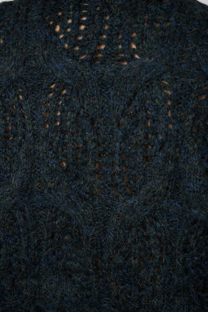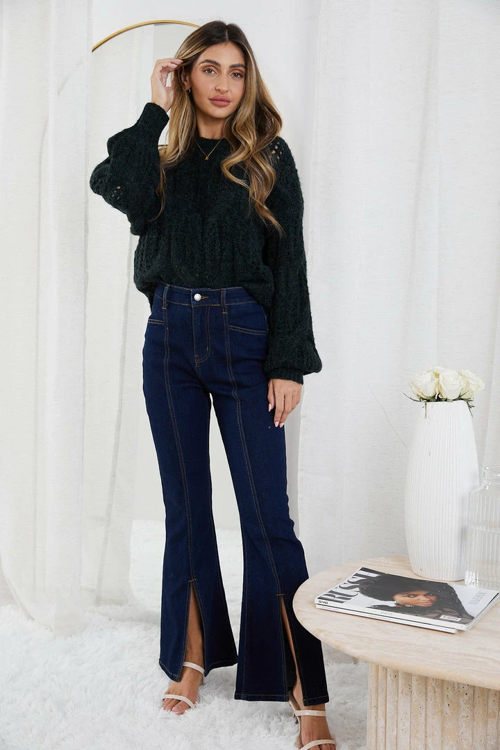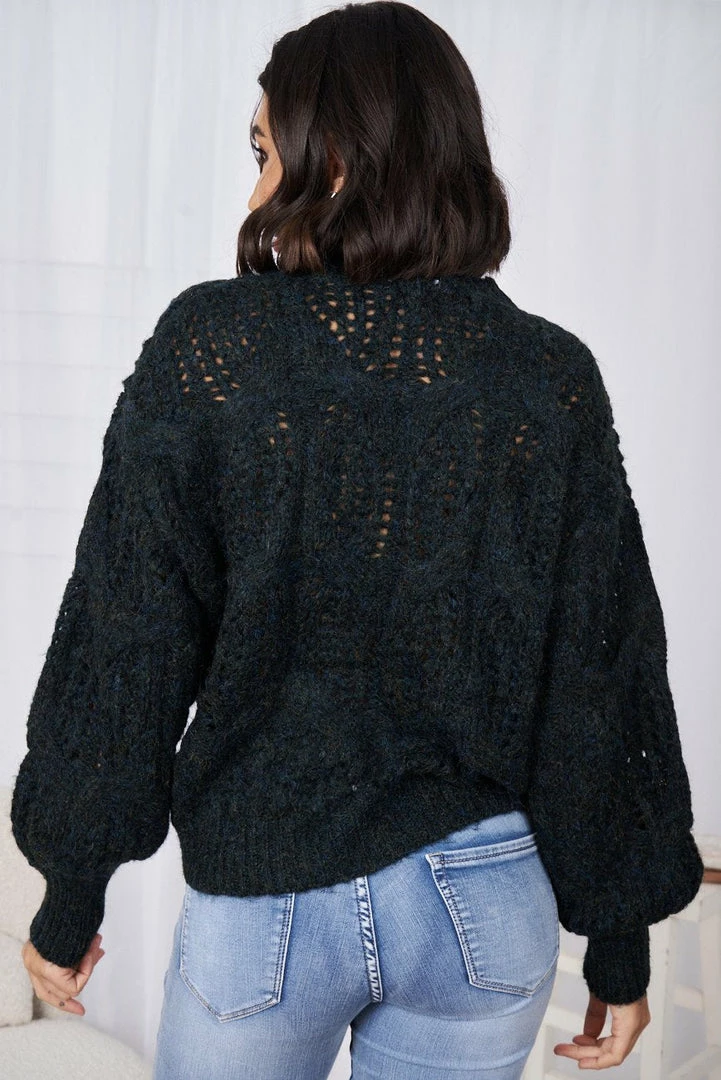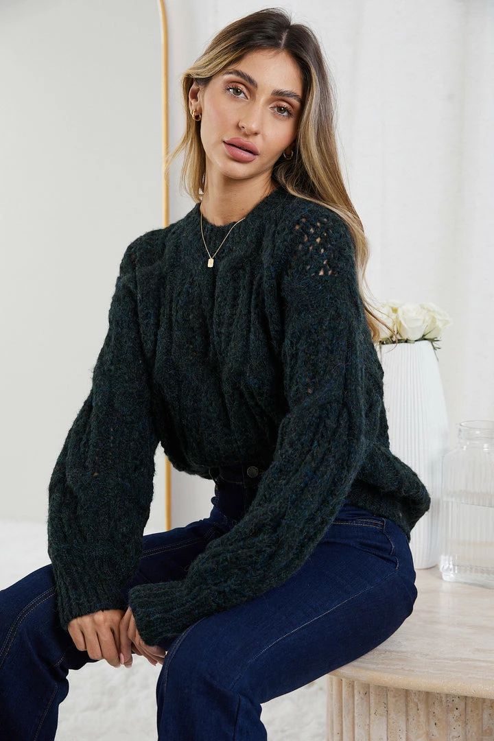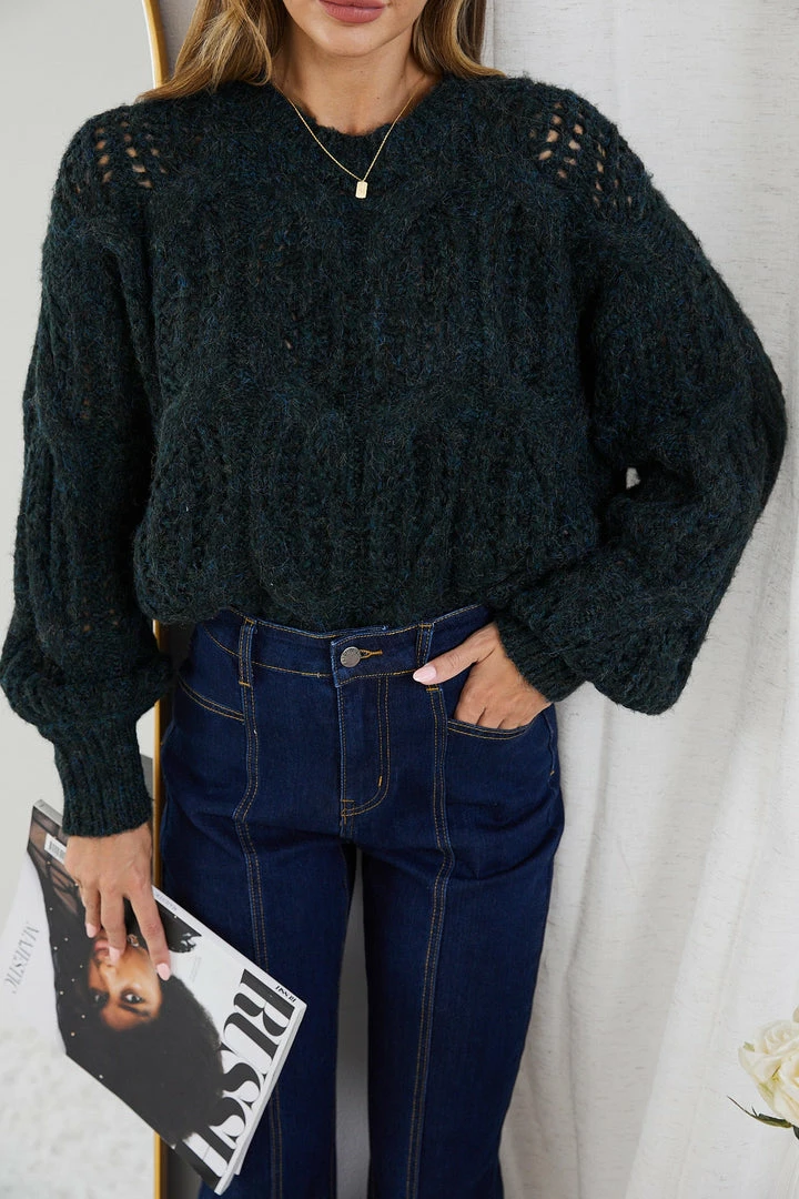 Our Delta Knit comes in a deep jade green tone. It features a high round neckline, long relaxed sleeves, and a woven knit pattern all over the garment. This cute knit is perfect for layering during the cold winter months!