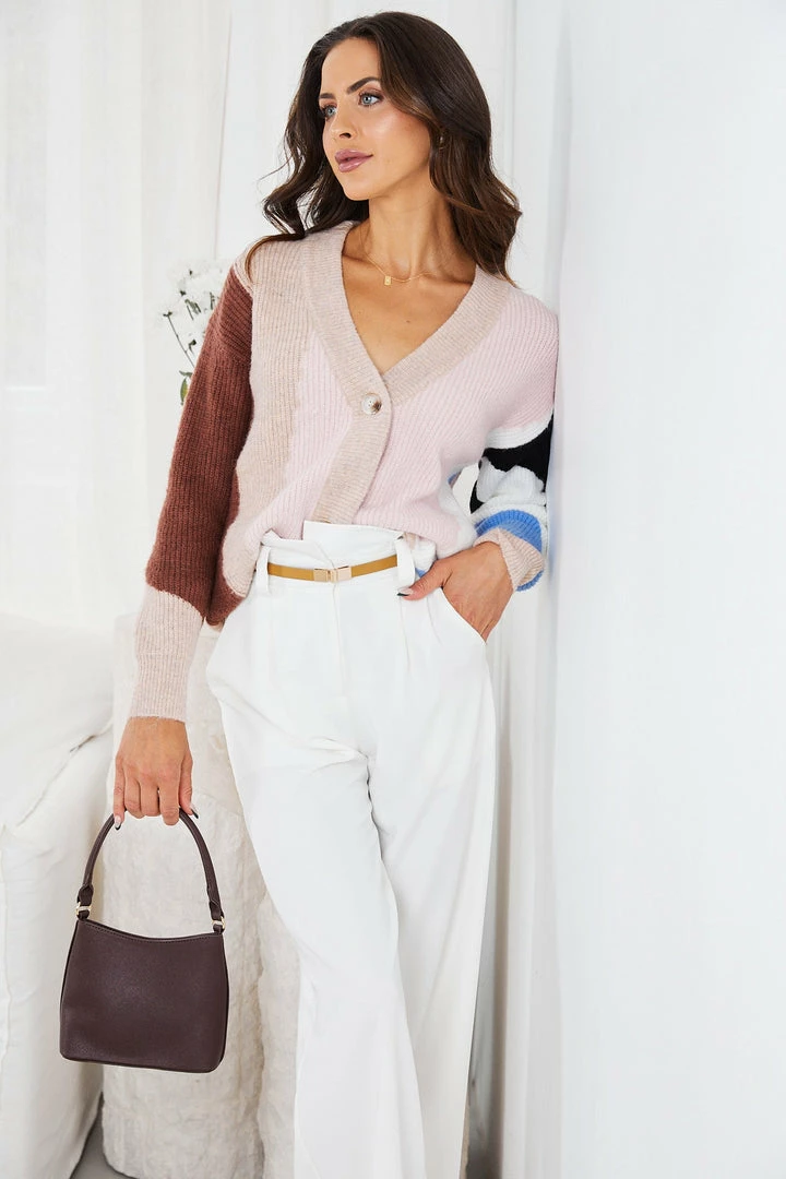 Our Dervila Cardigan comes in a blue, white, black, blush, beige & chocolate tone print. It features long relaxed sleeves & buttons on the front for a warm, comfortable fit. This cute cardi is perfect for layering during the cold winter months!