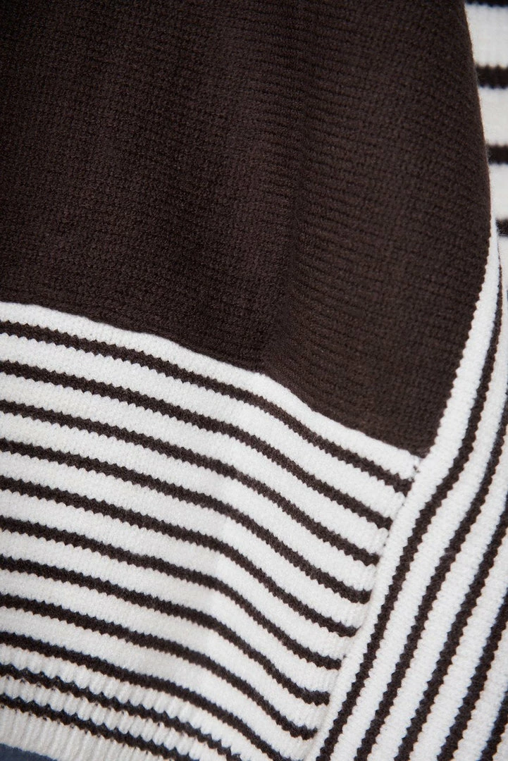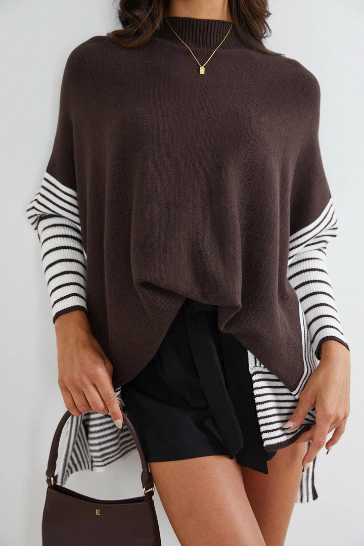 Our Doretta Knit comes in a coffee brown tone base, with a coffee and white tone stripe print. It features a high neckline, long relaxed sleeves, and a textured knit pattern all over the garment. This cute knit is perfect for layering during the cold winter months!