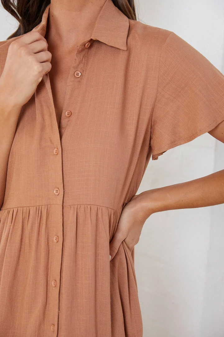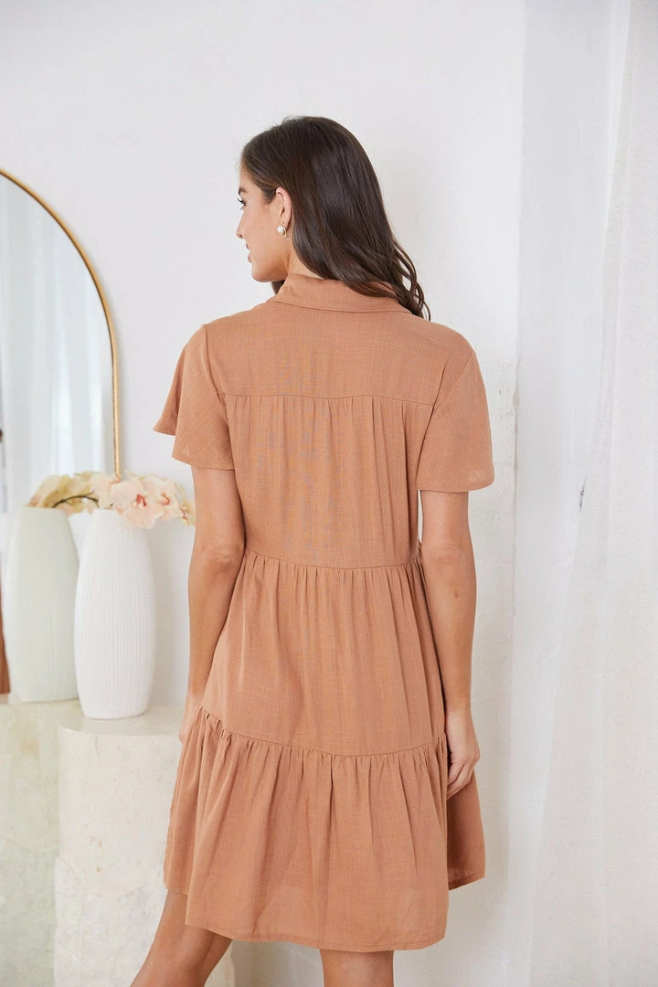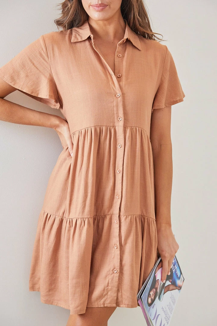 Our Calabria Dress comes in a tan brown colour. Because bright and sunny days call for a breezy lightweight fabrication, this mini is designed with a linen blend textile, classic collar, short flutter sleeves and tiered skirt. Be playful by matching this with a variety of shoes from sneakers, flats to heels!