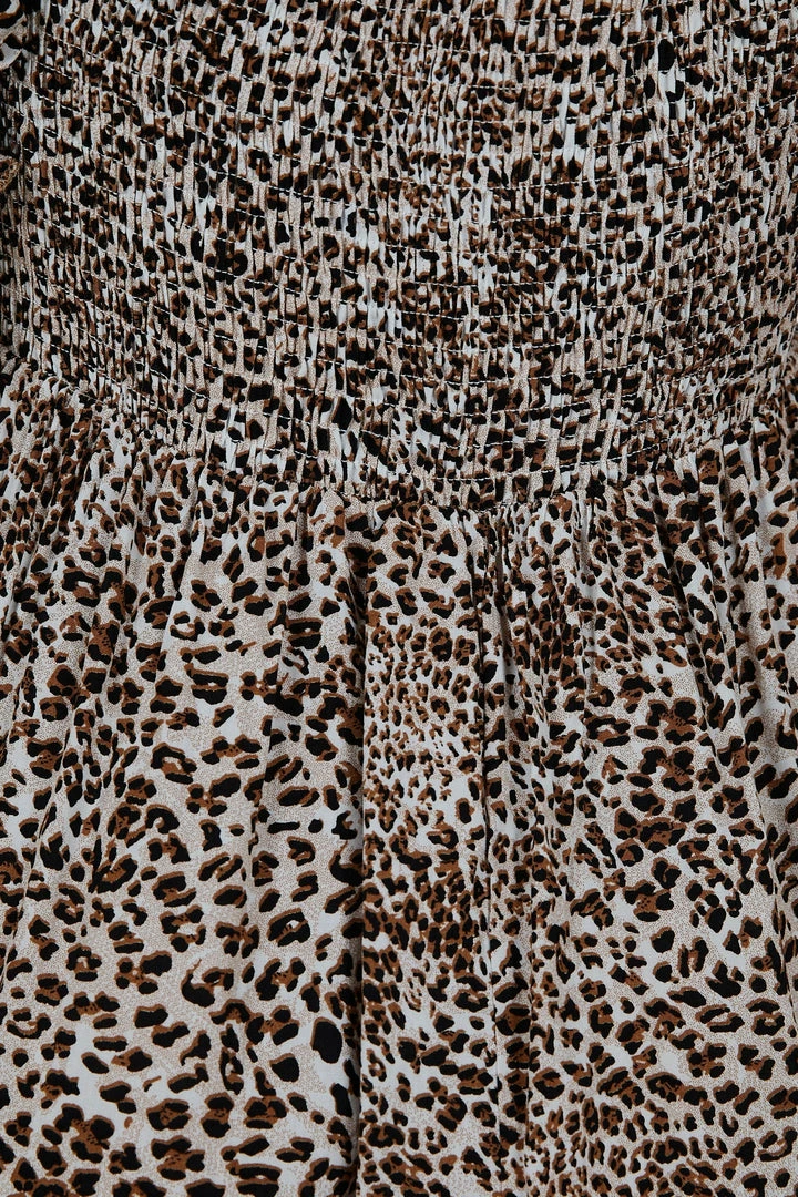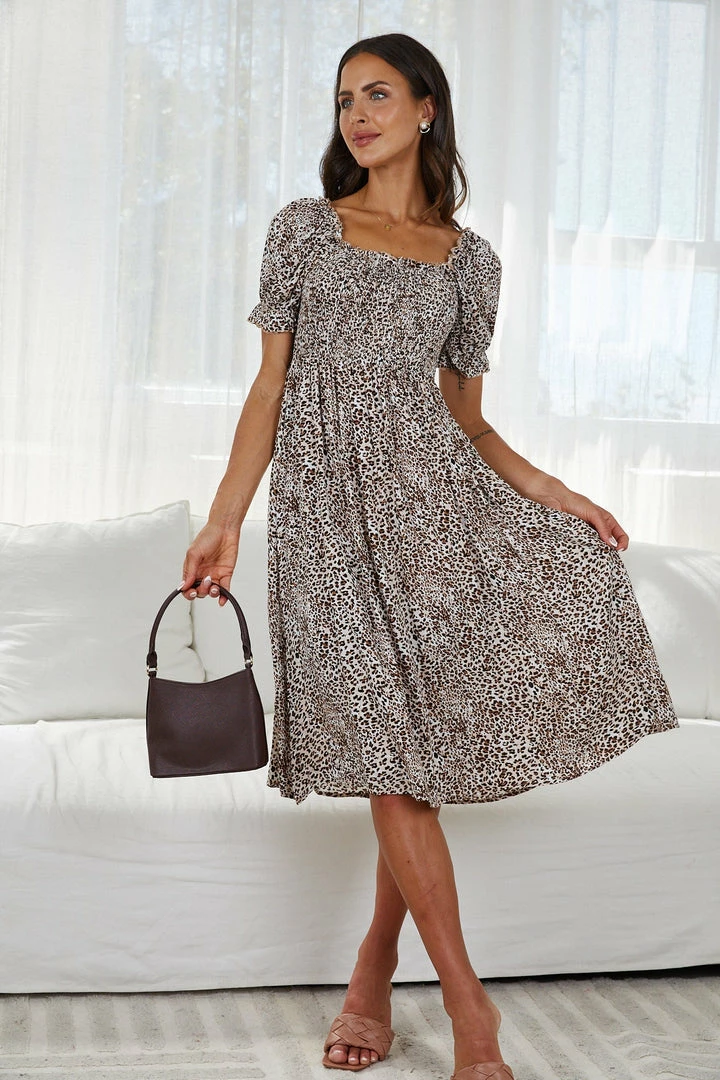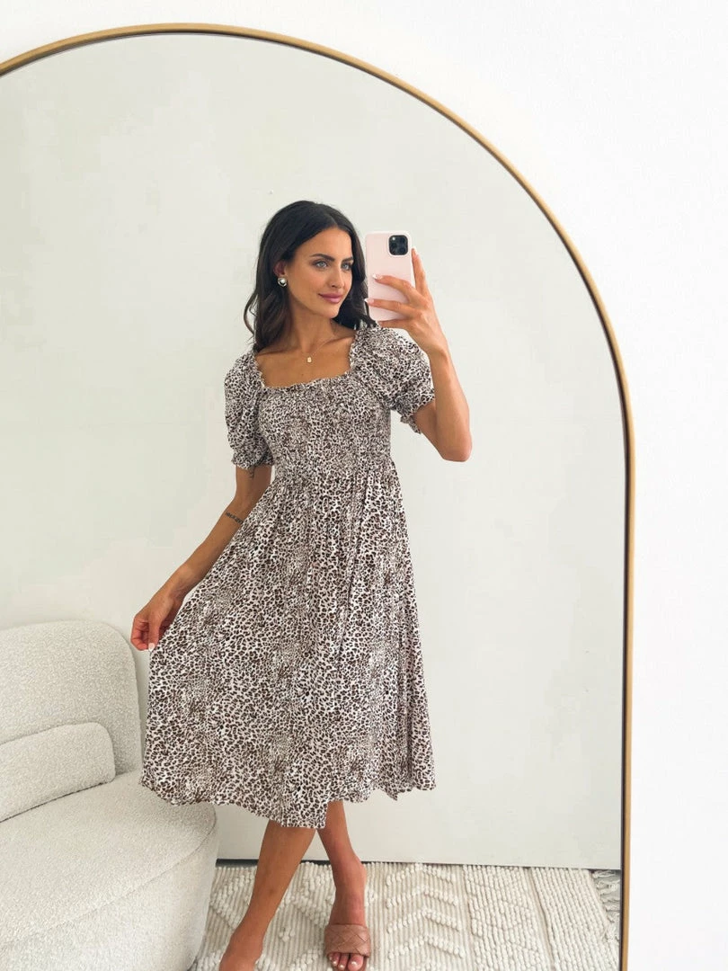 - Key Features: Midi length. Relaxed fit. Shirred bodice. Square neckline. Puff short sleeves. Breathable. Lightweight. Comfortable. Maternity friendly.