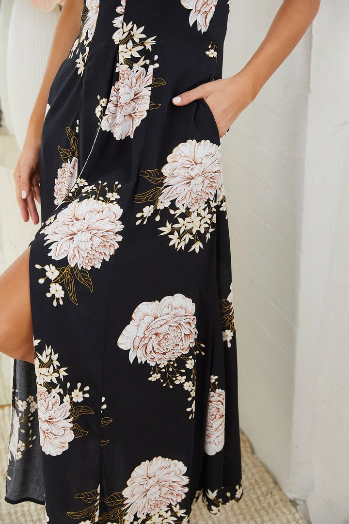 Our Wilhemina Dress comes in a posh black base with floral prints in blush and moss green. An envy worthy piece, this maxi features spaghetti straps, soft v-neckline and tight fit on the waist that flowingly flares towards the hem. Show off your legs through the front slit and pair with classic heels!