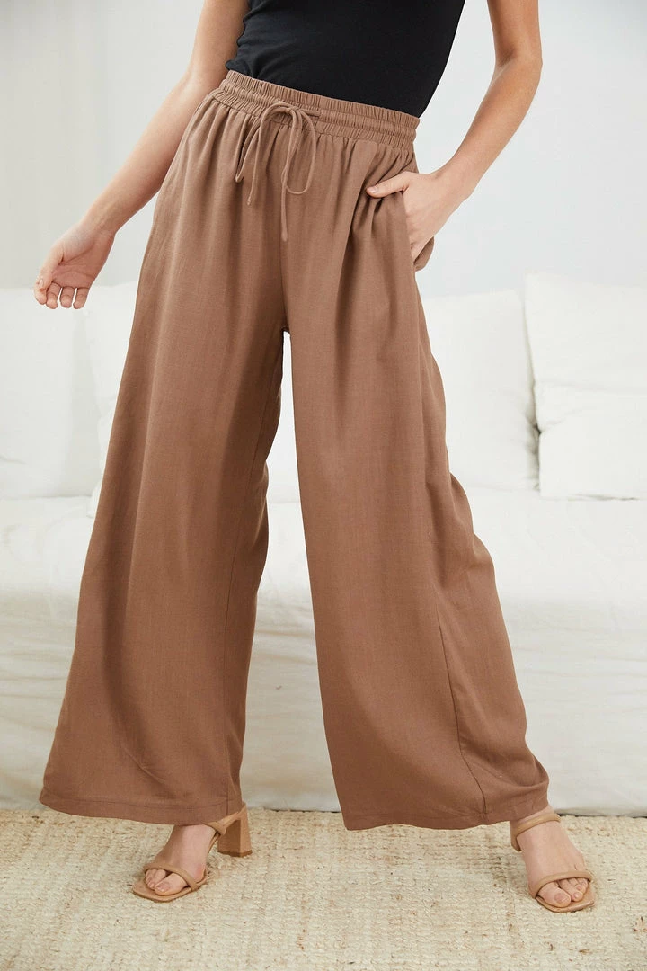 Our Gazella Pants come in a soil brown colour. Let these wide legged linen blend pants be your guide to carry you through the day with its elasticated waist with tie, ankle length hem and comfortable fit. This cosy staple can be worn with flats, sneakers or heels depending on the occasion!