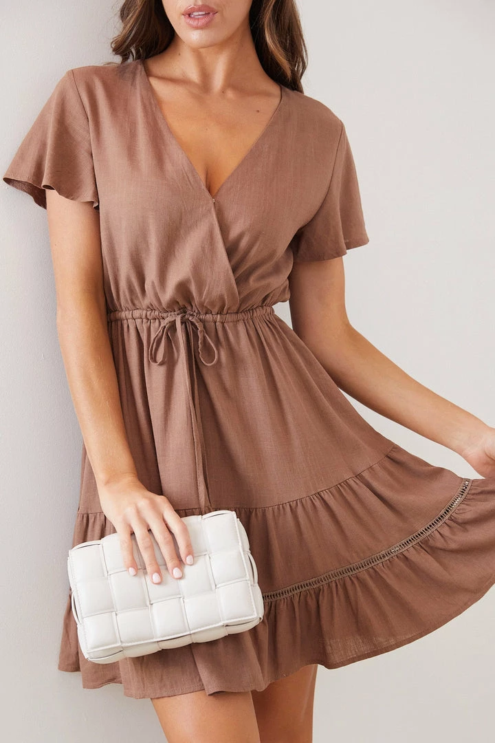 Our Huxley Dress comes in an attractive brown colour. Neutral toned summer works into action, this mini is designed with a surplice neckline, short flutter sleeves, waist tie and flowy tiered skirt with ladder lace trim. Stand out by pairing this with an embellished head band and a kelly bag!