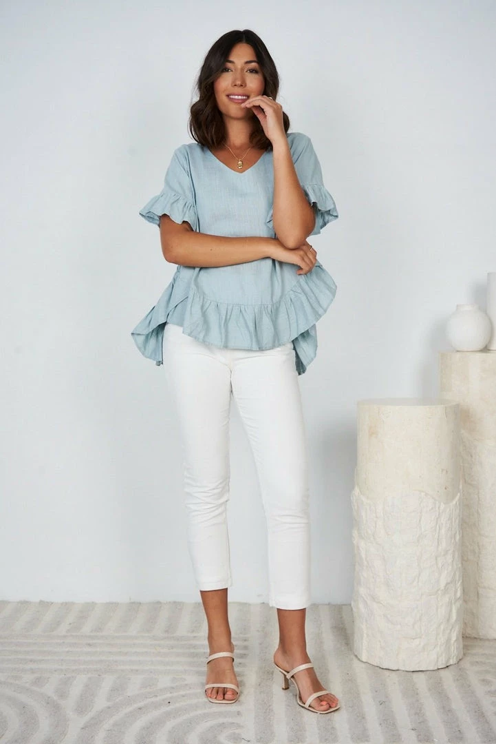 Our Kaleigh Top comes in a light blue tone. It features a v neckline & frill detailing on the sleeves & hem. This top pairs beautifully with basic pants for a fun casual look!