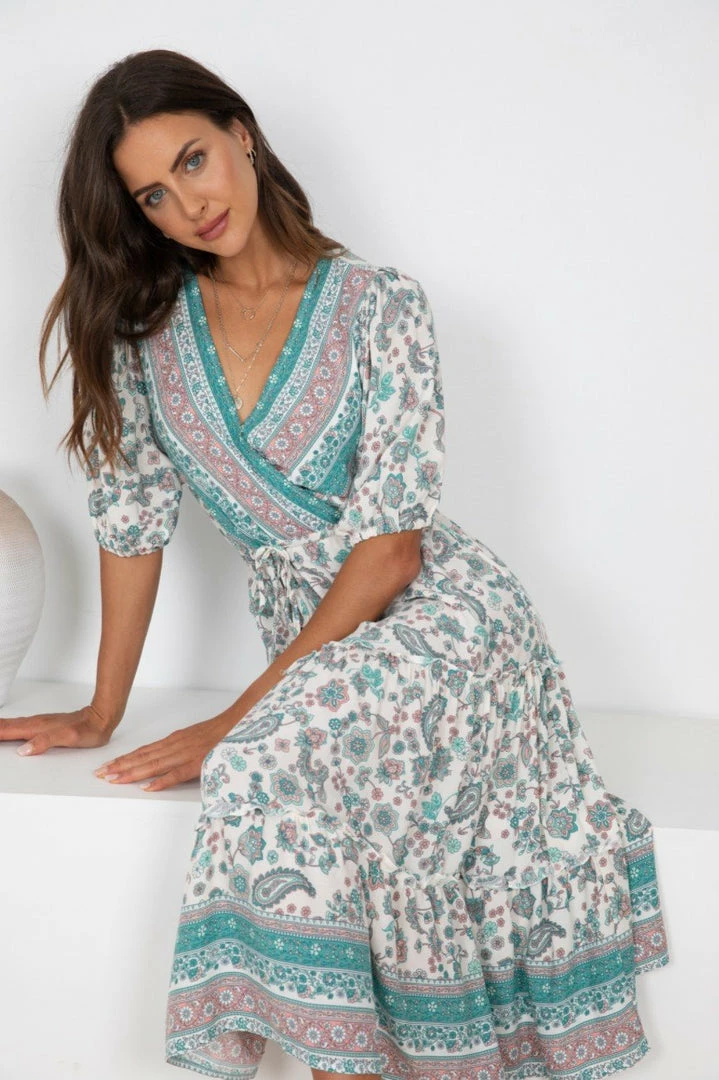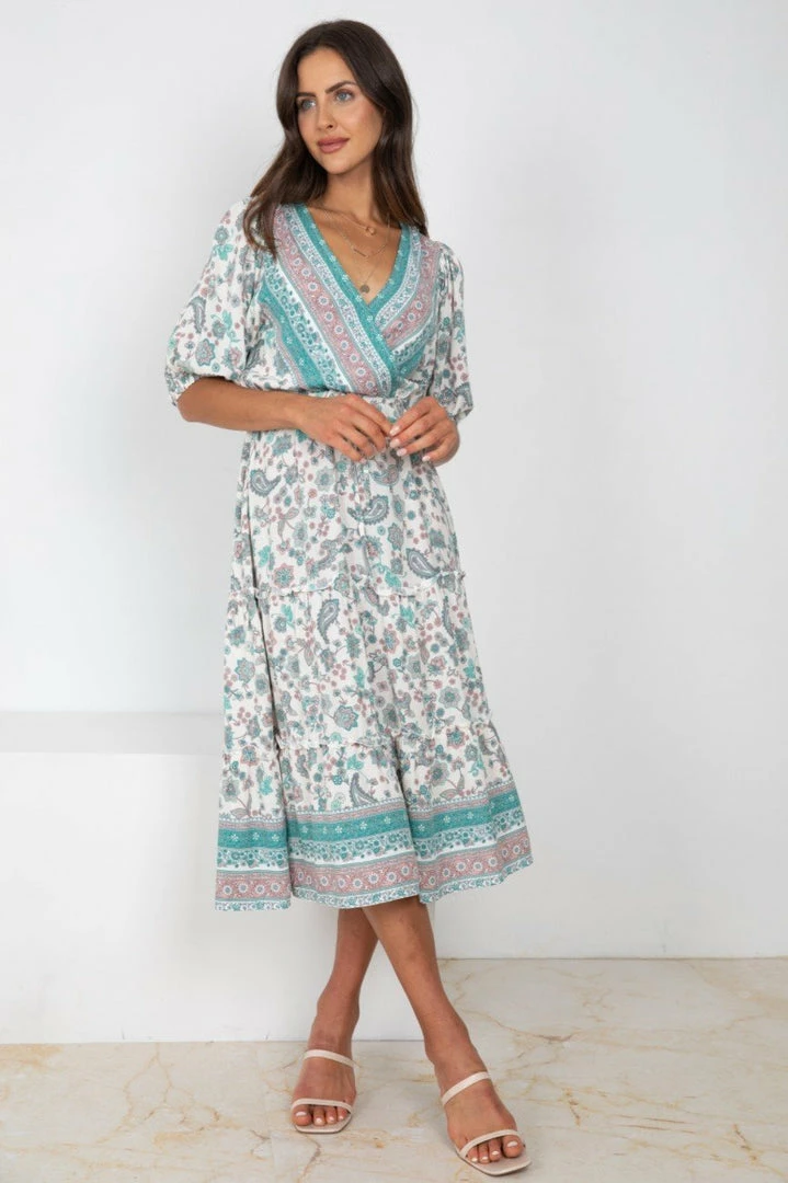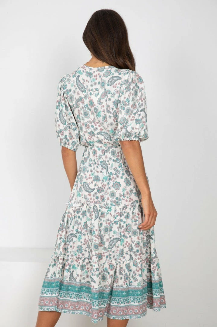 Our Karly Dress comes in a beige tone base, with a tuquoise and blush tone print. It features a v neckline and short sleeves for a relaxed, comfortable fit. This flowy midi pairs beautifully with heels for a fun look this spring season!