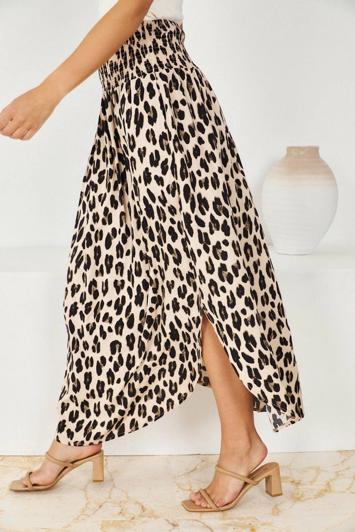 Our Marcelina Skirt comes in tan, brown, and black-toned leopard print. This maxi skirt features an elastic waistband perfect for cooler summer nights or warmer autumn days and pairs beautifully with any basic top!