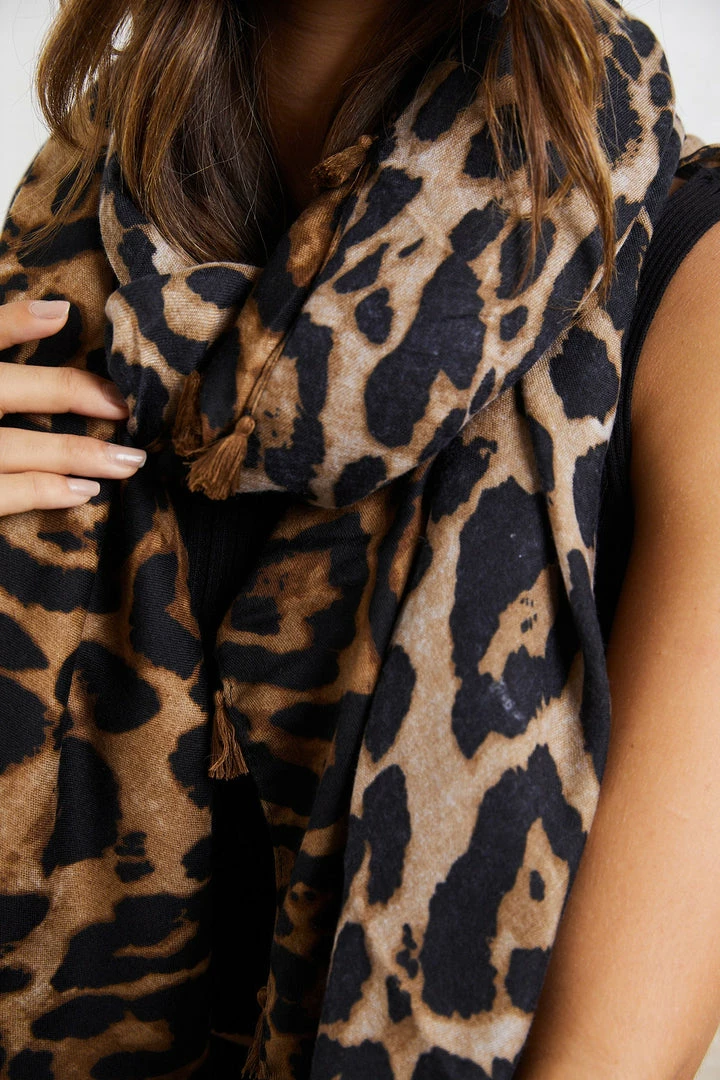 Our Noana Scarf comes in brown and black tones. A bold take on this classic accessory, this scarf boasts a leopard print pattern fabric and tassel detailing on the edge. Pair it with neutral colored boots for a sophisticated look.