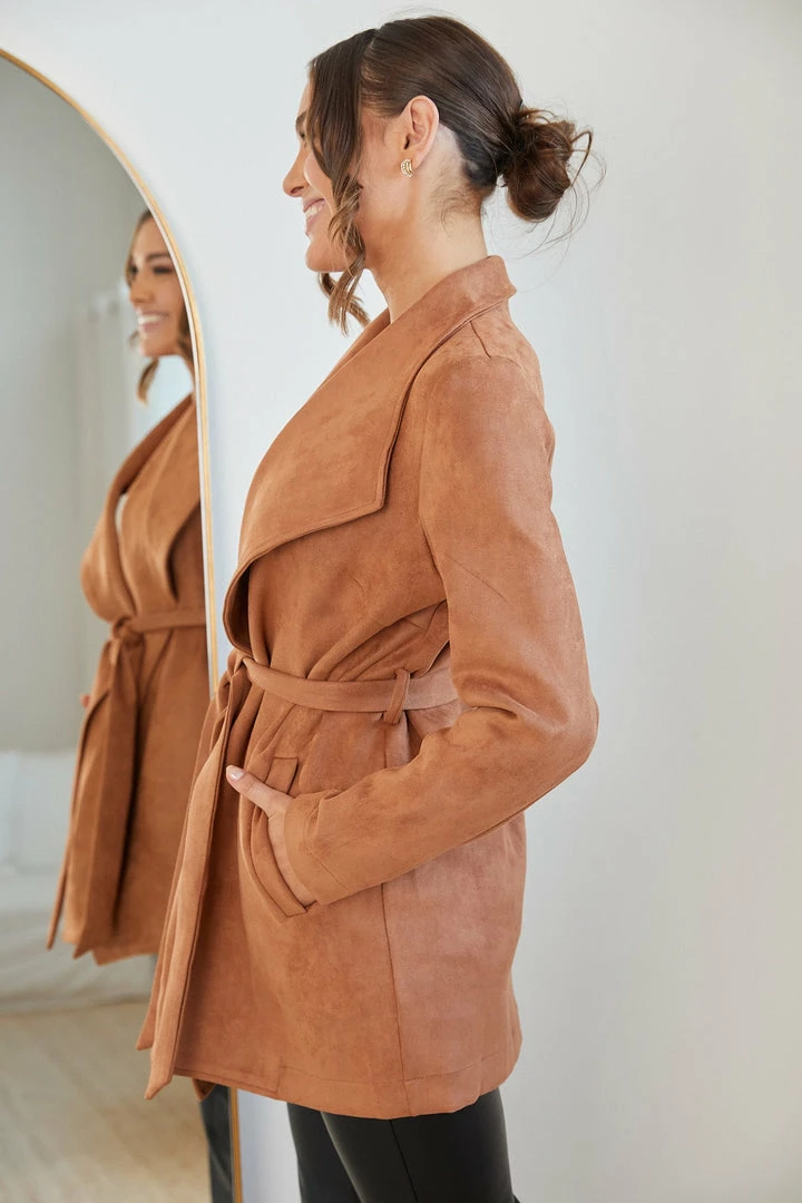 Our Odelia Coat comes in a lovely camel brown colour. The perfect topper for the cold-approved ensemble, this coat will smarten up your look while providing warmth with its oversized collar, long sleeves, fabric belt, functional pockets and thigh length hem. Classic laced boots and a cute beanie would pair nicely with this gorgeous piece!