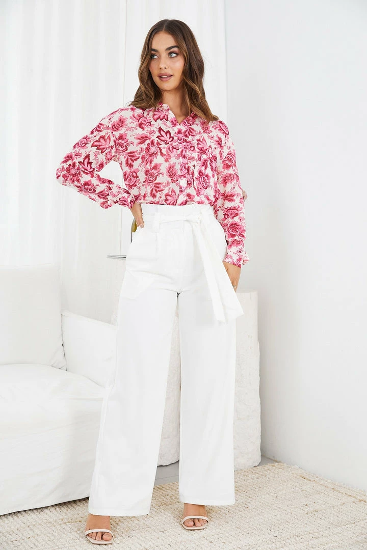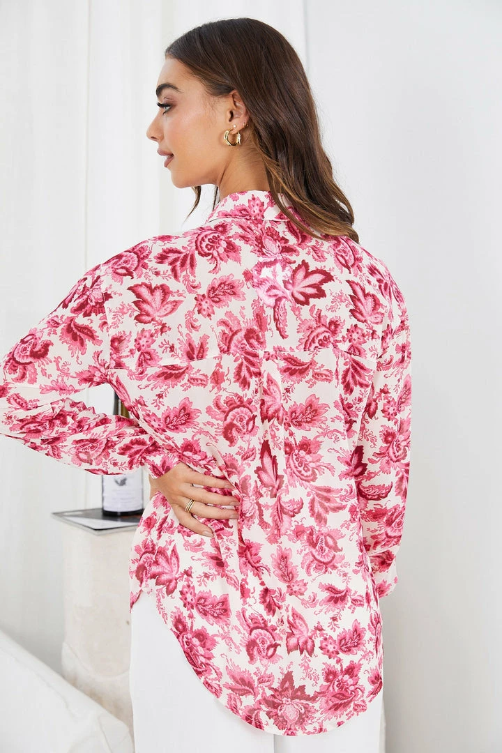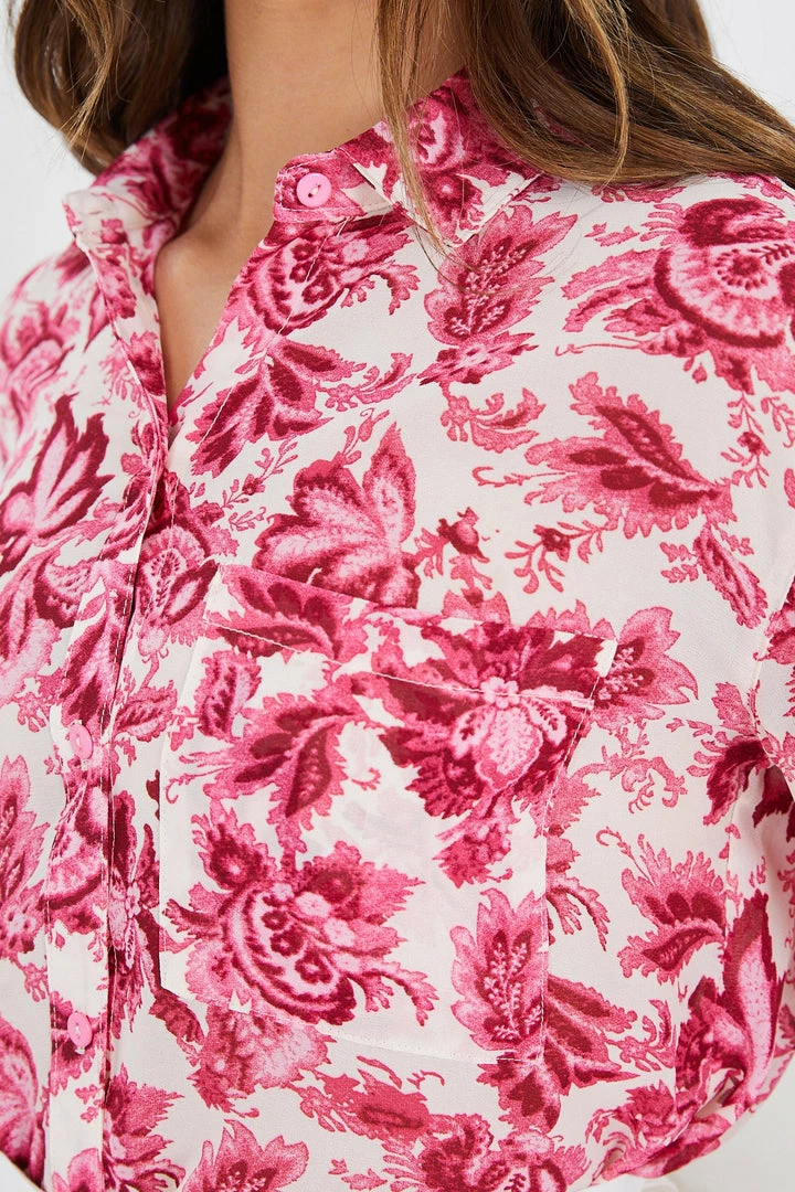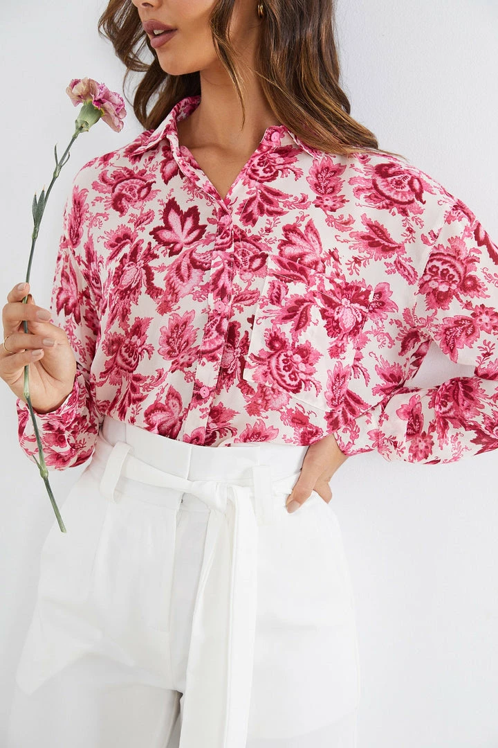 Our Ottilie Shirt comes in a cute fuschia floral print on a white base. Inspired by the classic shirt staple, this long sleeved top features a classic collar, buttons down the front and a patch pocket on the chest. Level up your look by tucking it in and adding a braided belt on the waist.