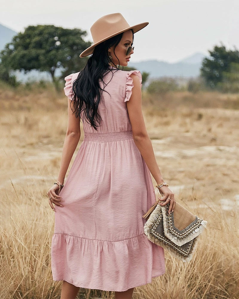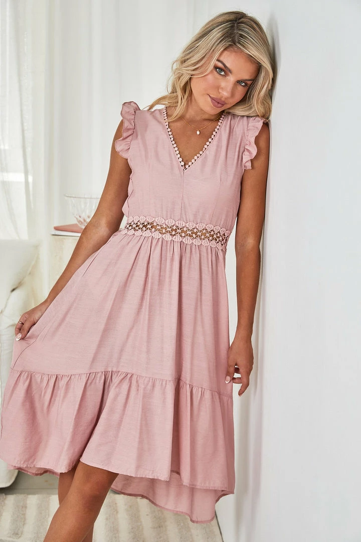 Our Dulcibella Dress comes in a soft pink tone. It’s a sleeveless midi that features a v neckline for a relaxed, comfortable fit. This midi pairs beautifully with heels for a gorgeous trans-seasonal look!
