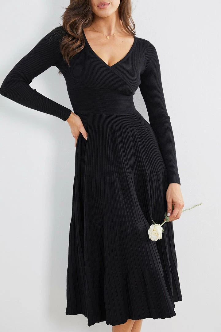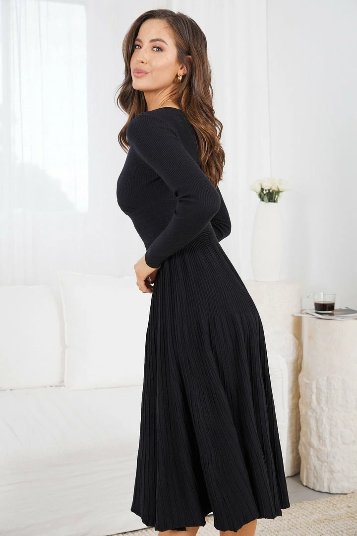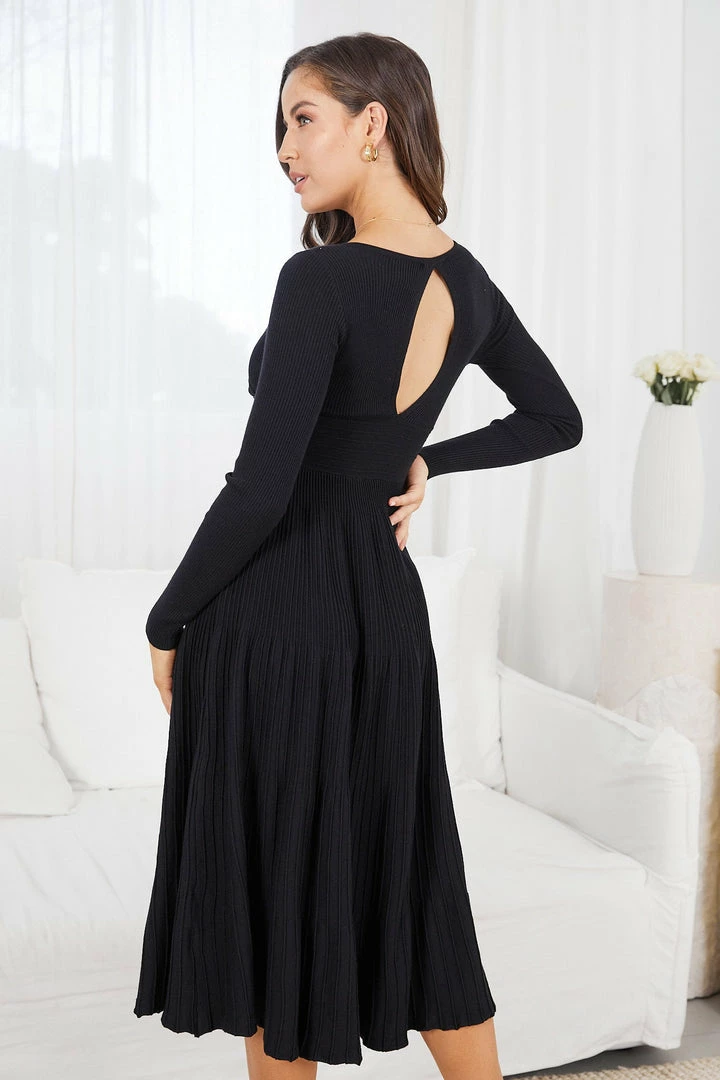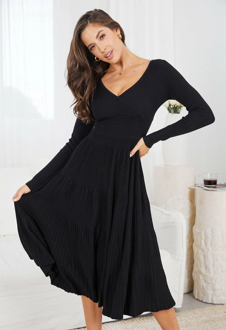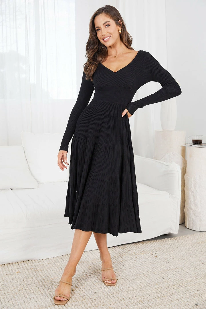 Our Sandralee Long Sleeve Dress comes in a sophisticated black colour. Make an impact the moment you enter the room in this long sleeved midi featuring a v-surplice neckline, ribbed waistline, keyhole back and a-line skirt. Pair it with pumps and a stylish handbag to complete the look.