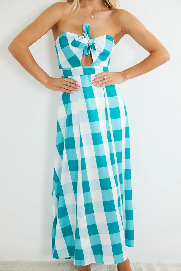 Our Sharis Dress comes in a green and white gingham print. This midi dress features a modifiable ribbon tie on the bust and a flowy skirt. This flowy dress is an eye-catcher this summer season!