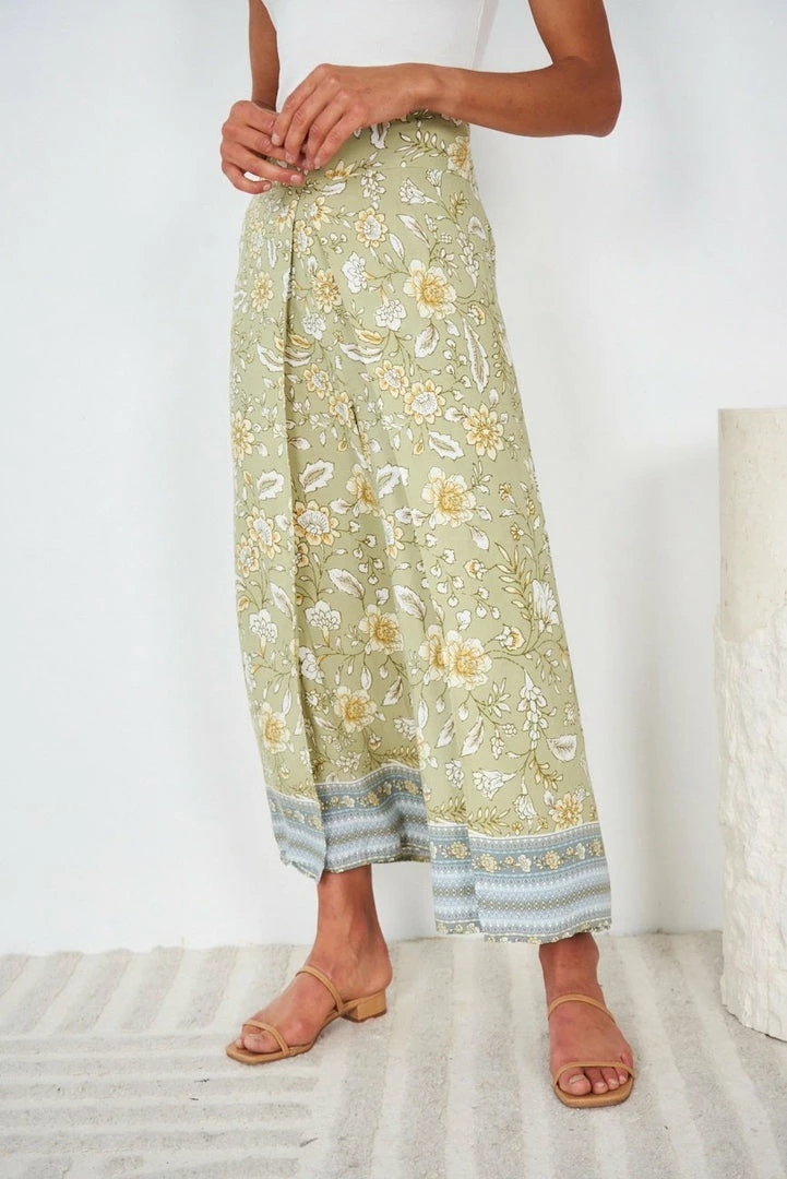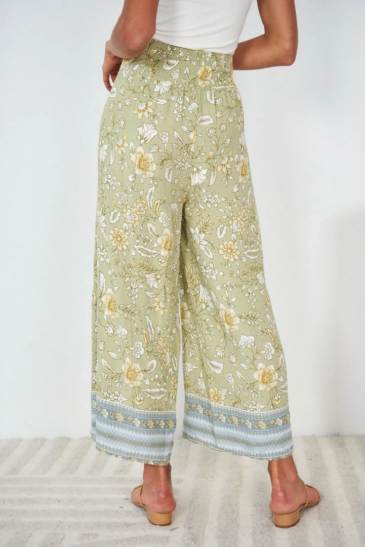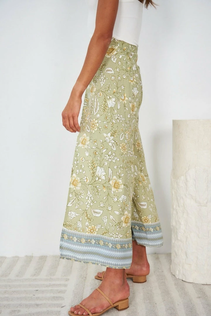 Our Jerry Pants come in an olive green tone base, with a yellow, light blue & white tone print. It features a midi-length and a wide-leg silhouette. These flowy pants pair beautifully with a basic top for a fun spring look!.