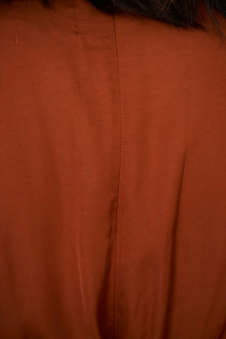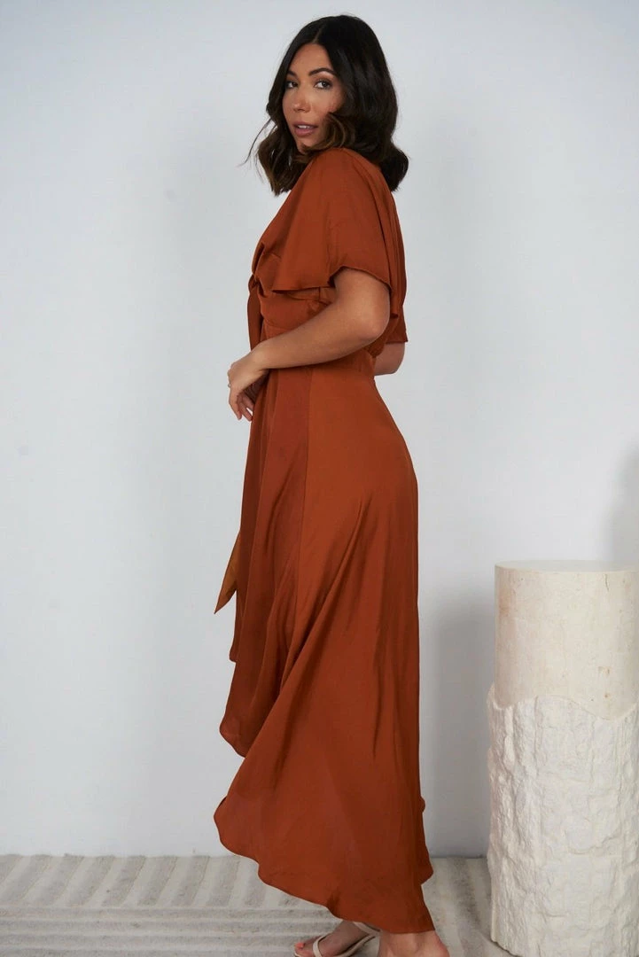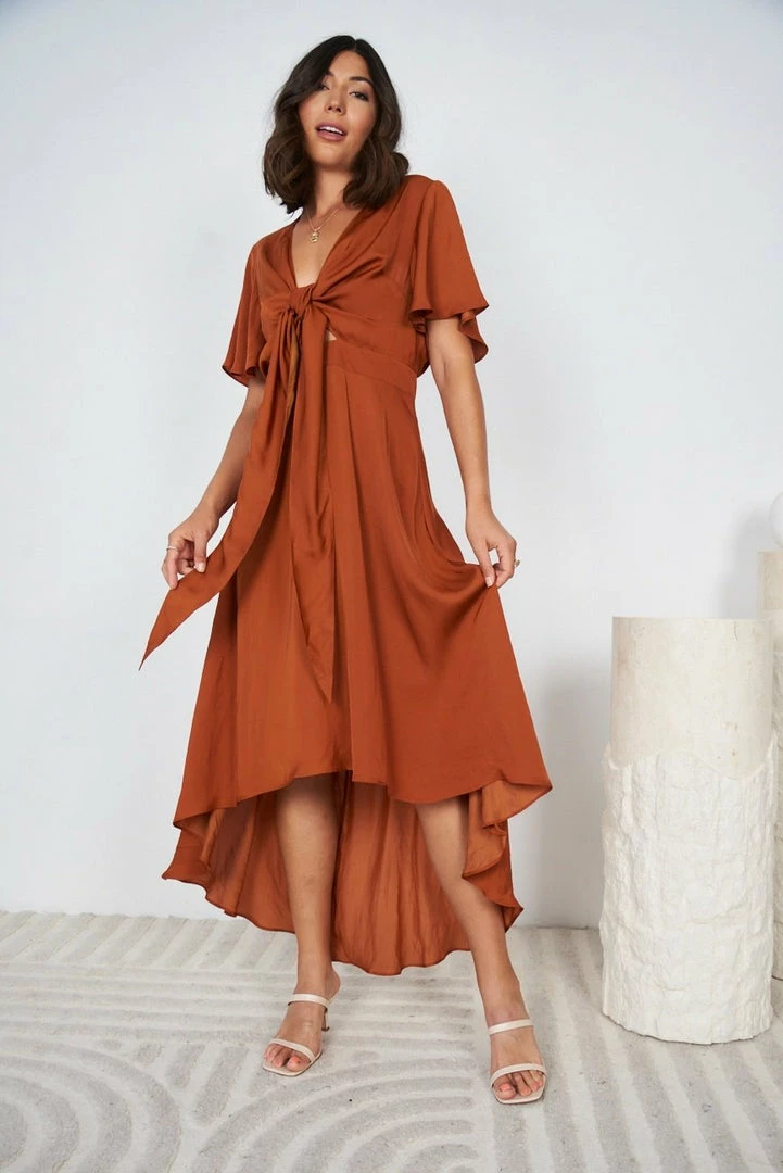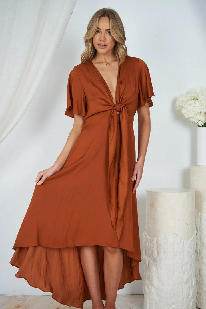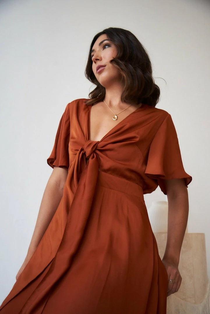 Our Bryla Dress is a summery play on our best selling Bryleigh Dresses. It’s a gorgeous lightweight material in a gorgeous orange rust tone. It features a high low hemline that floats around the body. The butterfly sleeves are light & airy sure to keep you cool during the warming months. The bust features a tie detail that makes this adjustable for various bust sizes.