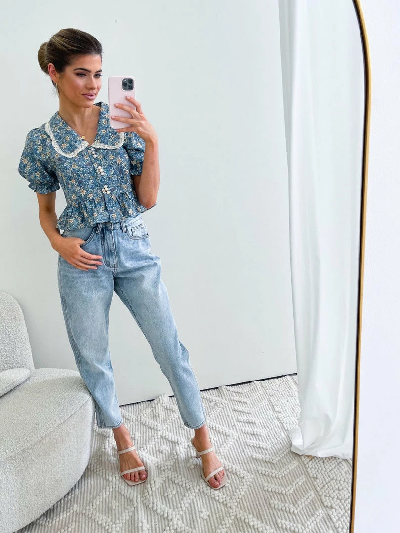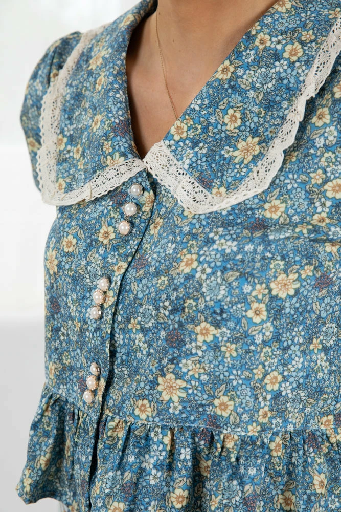 Our Ivy Top is a blue base with blue, cream, and brown-toned floral prints. This lightweight crop features puff short sleeves with cinched cuffs, collars with lace details, and functional buttons through the center front. This feminine crop is beautifully vibrant and wears like a daydream!.