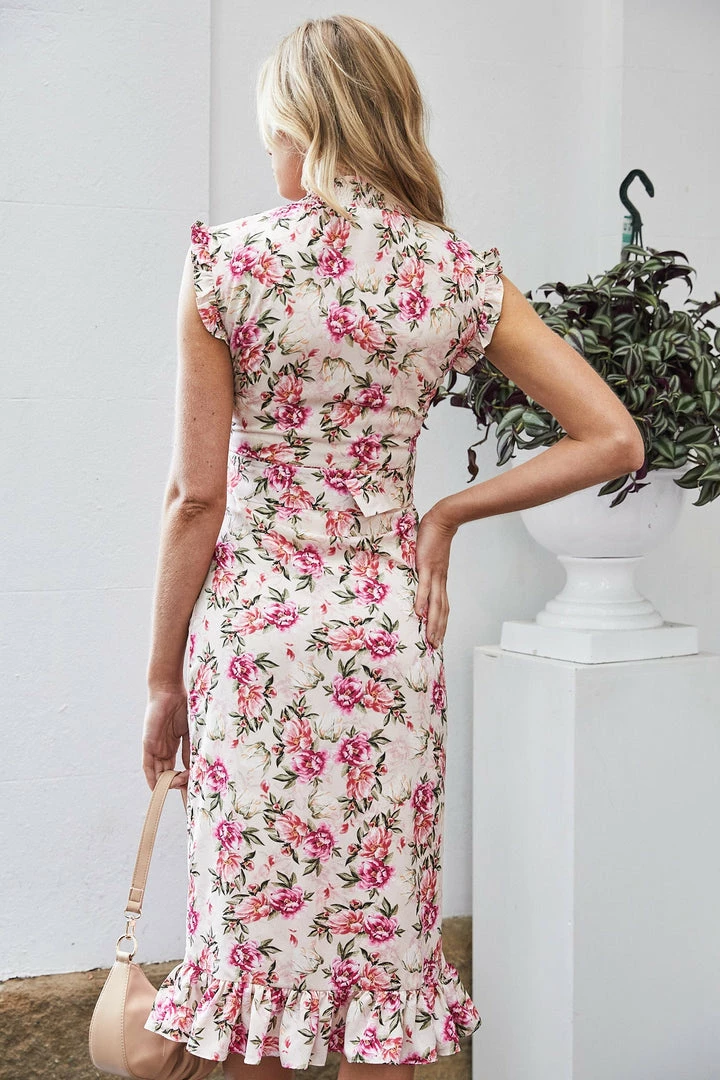 Our Owena Dress comes in a beige tone base, with a pink & green floral print. It features a high gathered neckline and a fabric belt to cinch in the figure beautifully. This flowy midi is a gorgeous addition to your spring wardrobe!