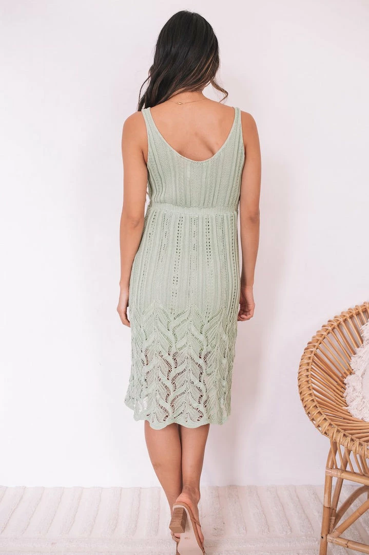 Our Castaway Dress comes in a subtle sage tone. It features a v neckline and a subtle scallop hemline. This dress pairs beautifully with thick gold hoops for that perfect brunch by the beach look!