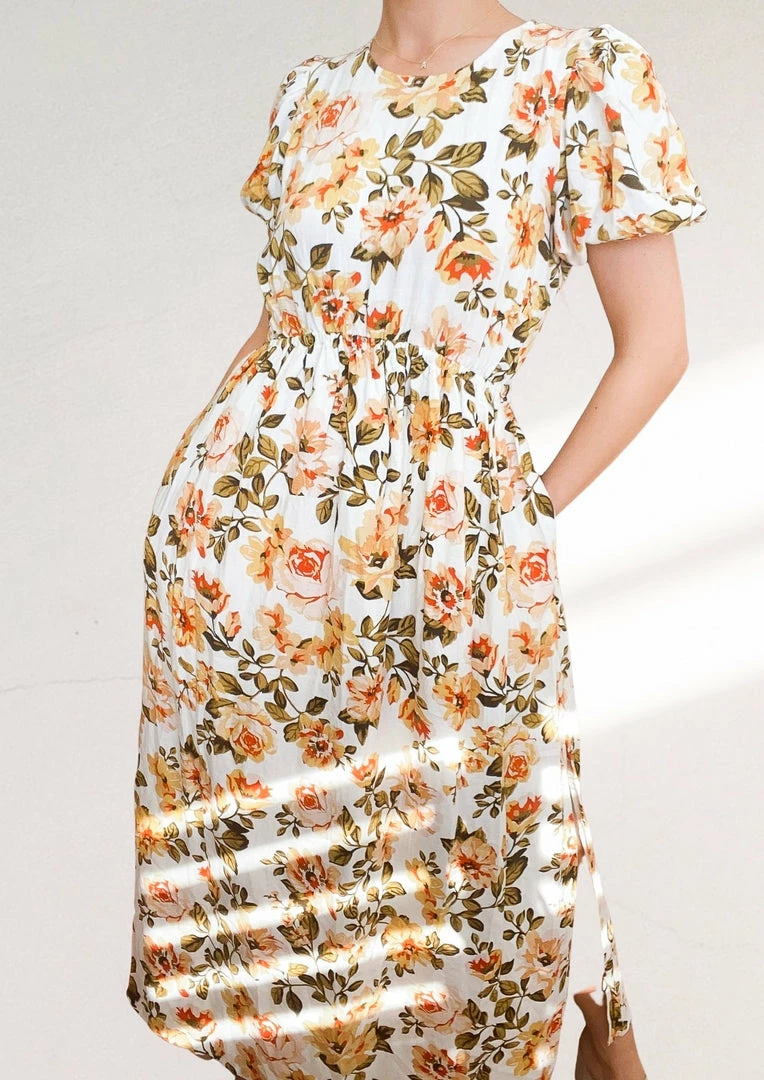 Our Dejavu Dress comes in a white tone base, with a yellow and sage tone floral print. It features a high neckline and short sleeves for a relaxed, comfortable fit. This midi pairs beautifully with heels for a stunning spring look!