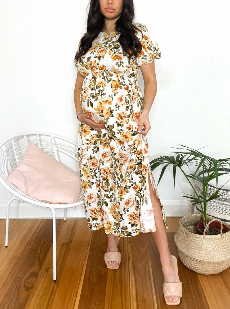 - Key Features: Midi length. Relaxed fit. High neckline. Short sleeves. Maternity friendly.