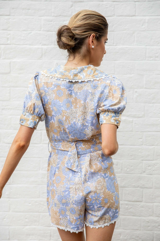 Our Nona Playsuit comes in a beige & blue tone floral print. It features a v neckline, short sleeves, buttons down the front, & a fabric belt to cinch in the figure beautifully. This playsuit is a cute addition to your spring wardrobe!