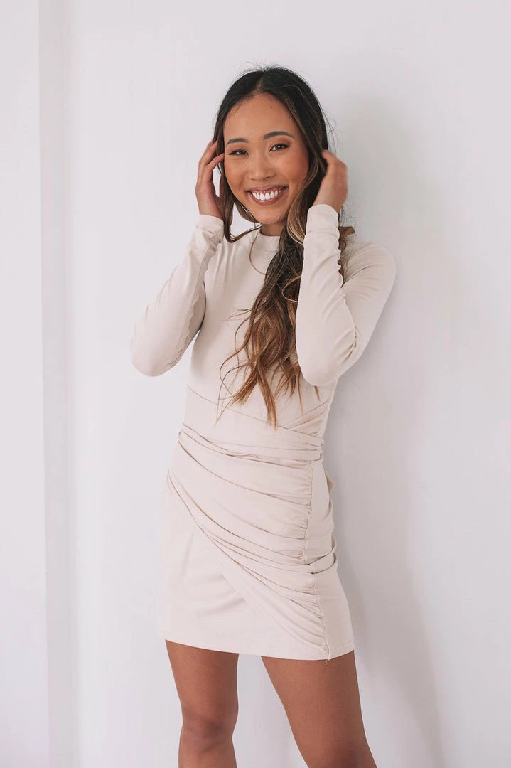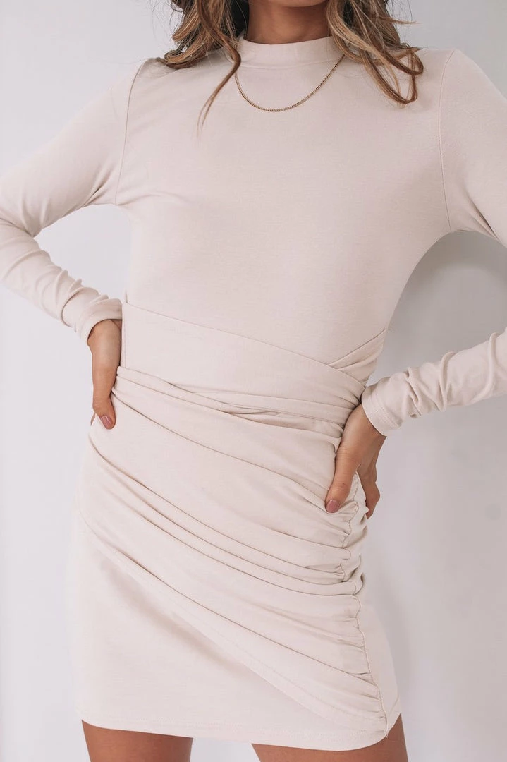 Our Maribel Dress comes in a subtle beige tone. This stunning jersey dress features a relaxed high neckline, long sleeves, and a fabric waist tie to cinch in the figure beautifully. Pair with you favourite pair of heels for a classy winter look!