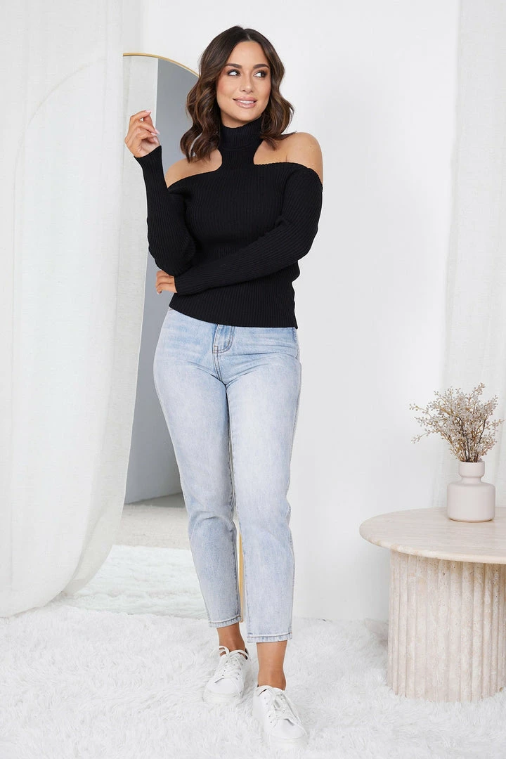 Our Vien Knit Top comes in a classy black colour. Set to become your new wardrobe favourite, this knit top features a choker neckline, cold shoulder design and long fitted sleeves. This staple pairs beautifully with jeans for a laid-back outfit or a leather skirt and laced booties for a more dressed up look!